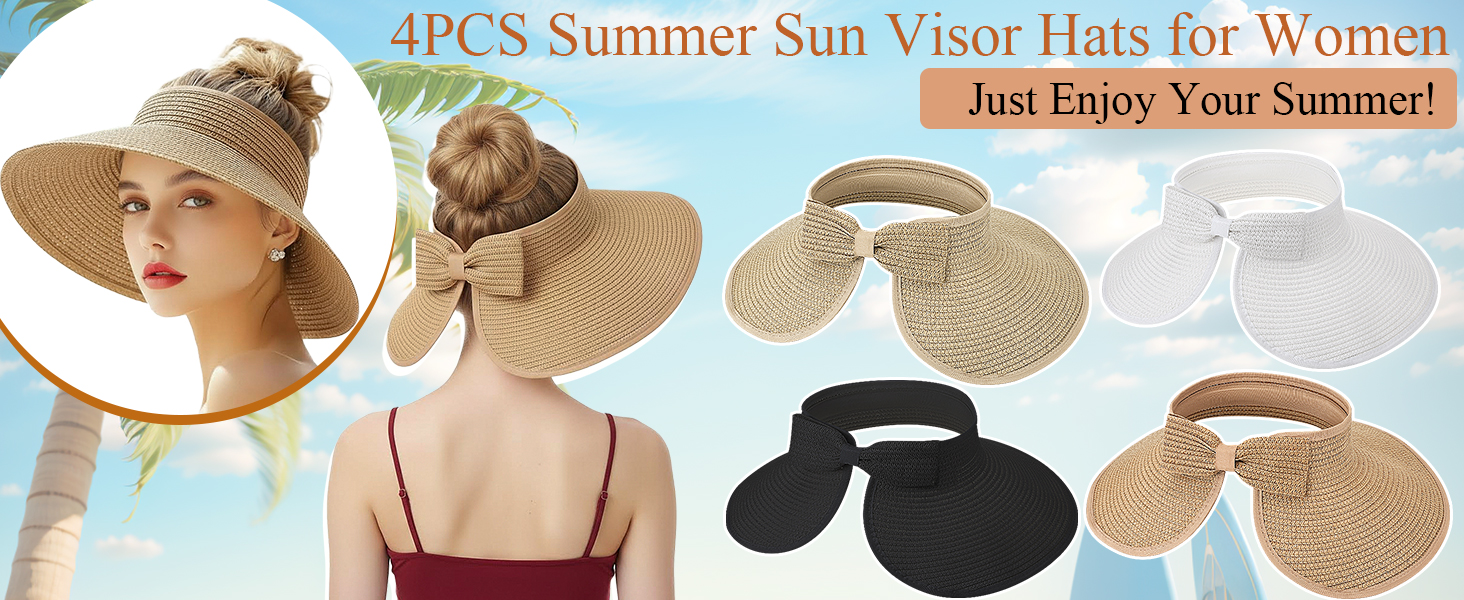 4 Pack Foldable Straw Sun Visor Hats for Women Wide Brim Summer Beach Hat Packable Ponytail Visors Beige Khaki Black White Adjustable Sun Protection