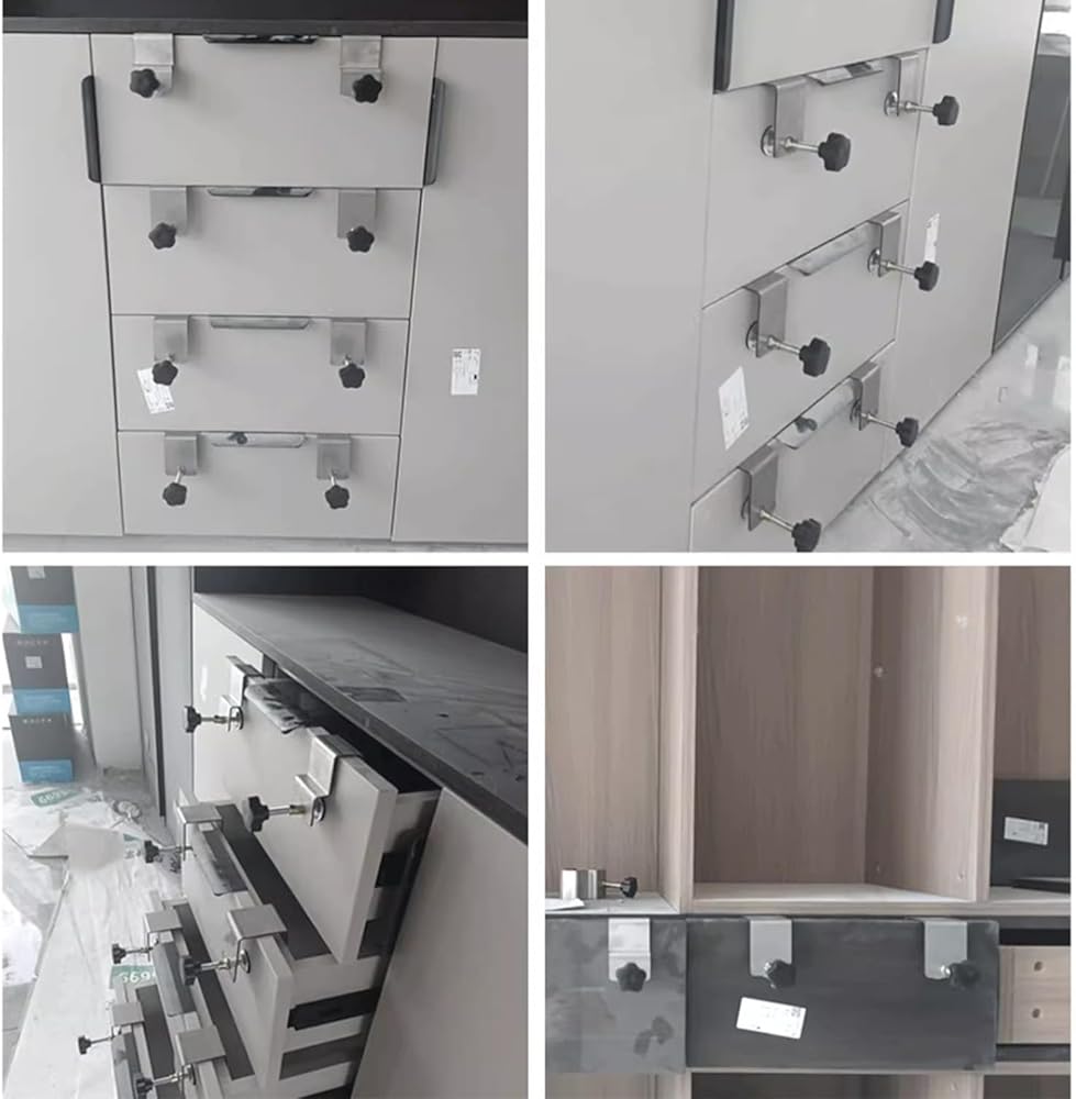 👍【Quick Installation】Drawer fixing clips will free your hands and make it easier and more accurate to install and repair cabinets, tables, desktops, furniture, etc. Suitable for sheet objects of different sizes and thicknesses and different materials (such as acrylic, glass, wood, iron and stone). The jig can still be used when the drawer is closed.