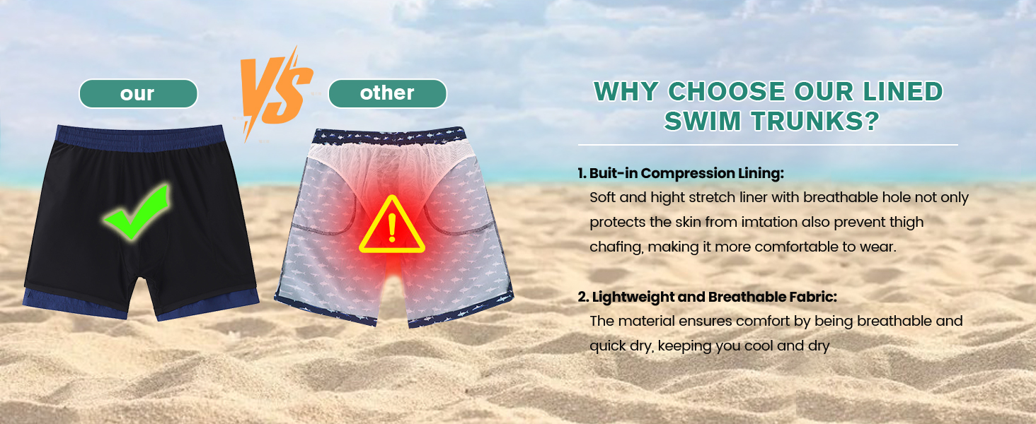 Waterproof & Quick-Dry Fabric: Mens swim trunks with compression liner made from high-quality breathable material, board shorts men's are waterproof, lightweight and quick-drying 5-8 mins, ensuring you stay cool and comfortable in hot summer days