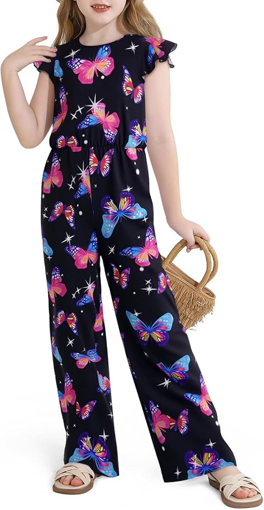 Stylish Design: This girls jumpsuit features a round neckline, adorable ruffle cap sleeves, casual jumpsuit with side pockets, while the back zipper and wide leg design adds a contemporary flair, allows your child to move freely and play without any restrictions
