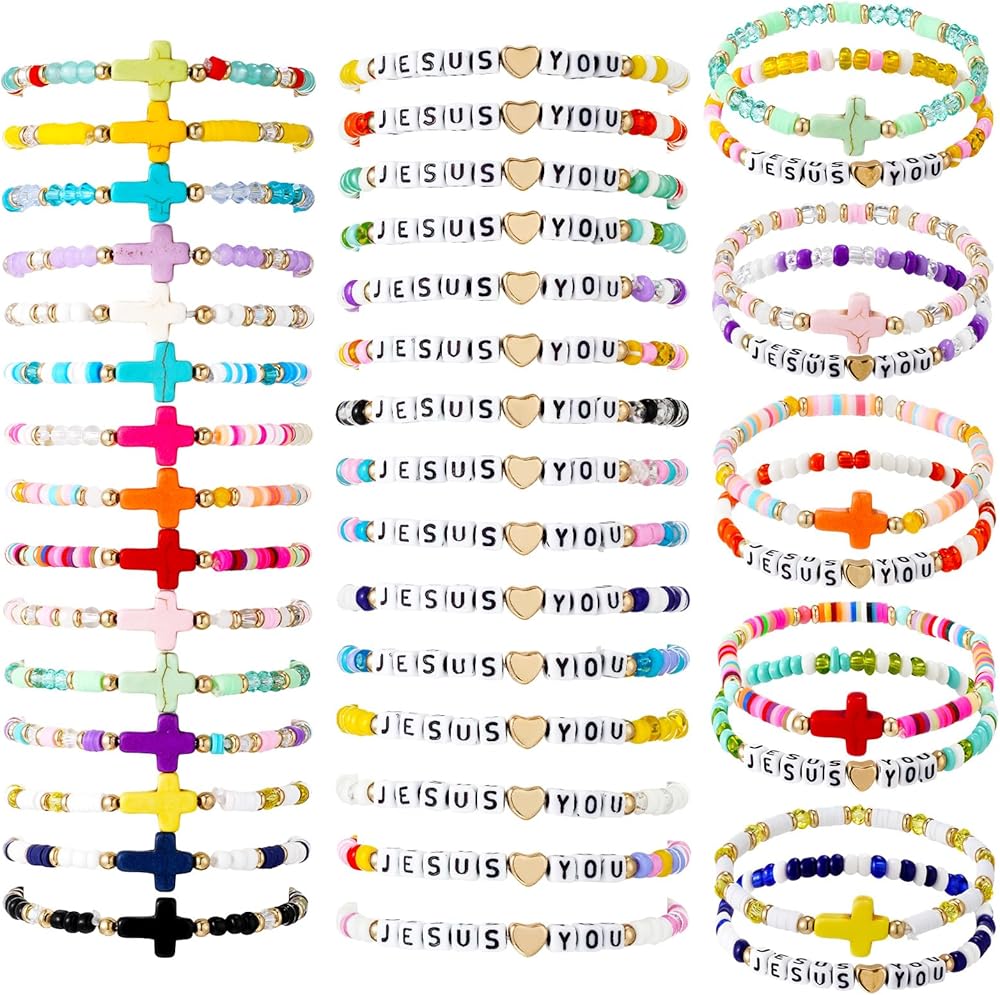 60 Pcs Jesus Loves You Christian Bracelets Bulk Easter WWJD Colorful Friendship Bracelet for Women Bible Verse Religious Cross Beaded Wristband for Church Reminder Jewelry Gift