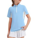 Quarter Zip Neck: Gilrs short sleeve t shirt made a mock neck design with a contrast white half-zip, easy for kids to put in and out. Athletic cut with slight relaxation offers freedom of movement and a modern silhouette.