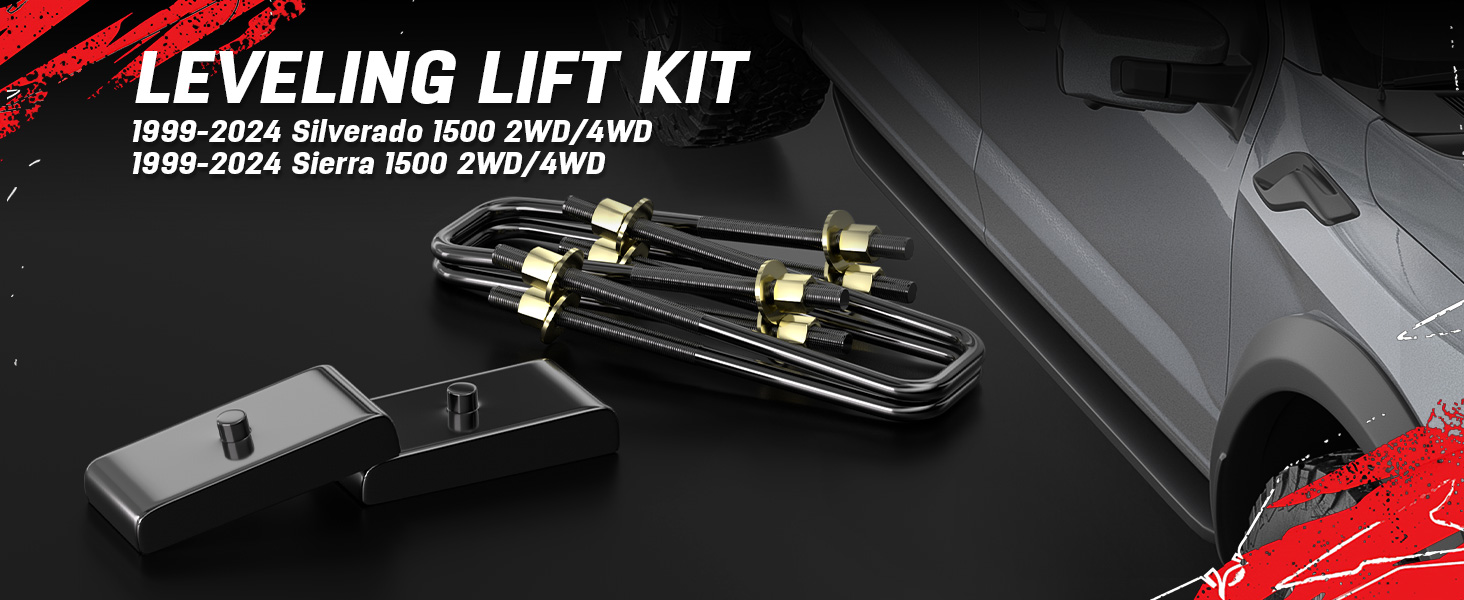 Note: Improve the rear of your truck by 1 inches, bringing a perfect change in the appearance, performance and style of your truck. Because of suspension geometry,the ratio between lift height and kit thickness is not 1:1
