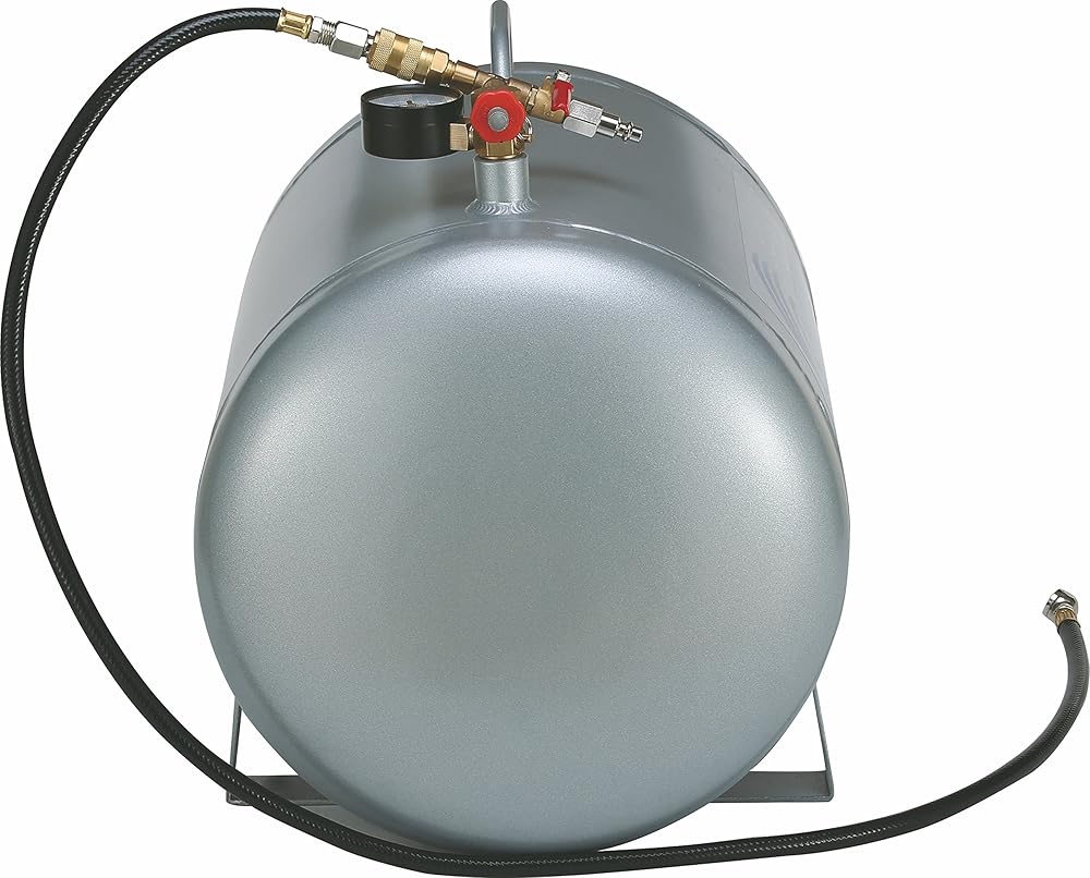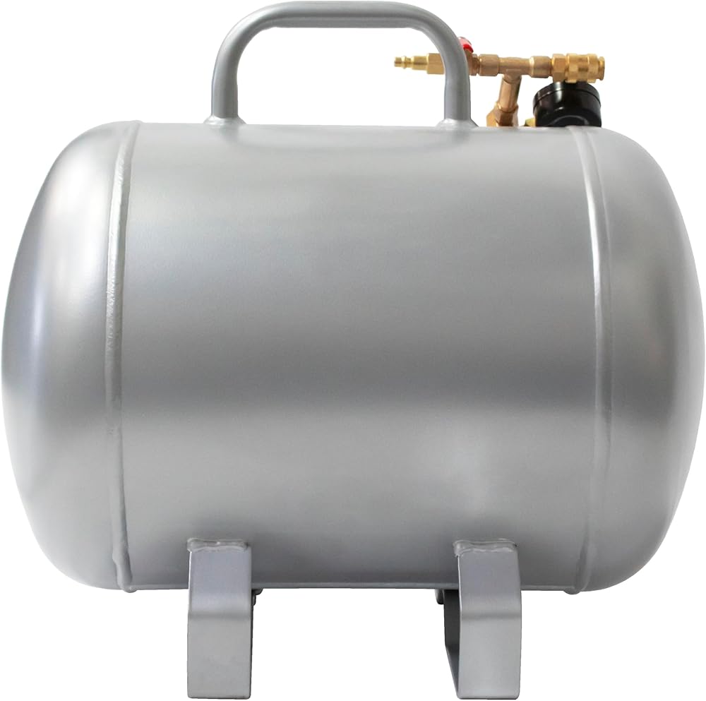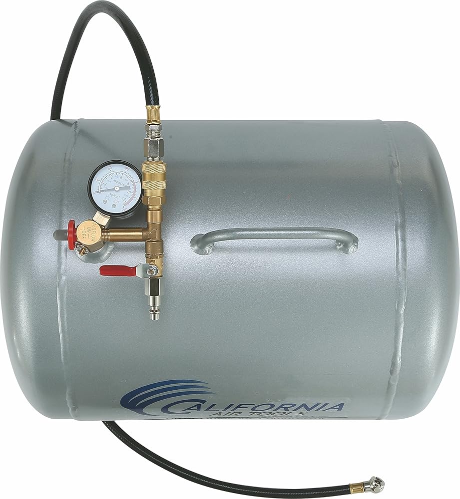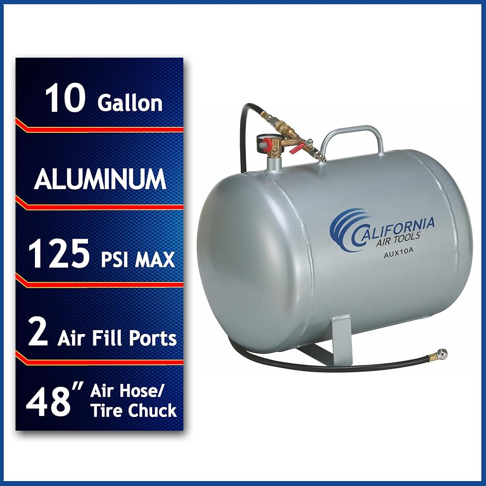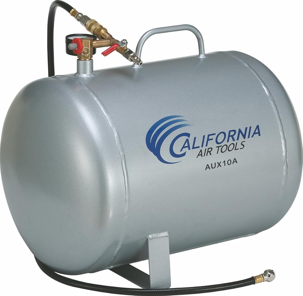 California Air Tools AUX10A - 10 Gallon Aluminum Auxiliary Air Tank is designed for portability and easy to use. The No Rust Aluminum Air Tank is lightweight and easy very easy to carry and transport. California Air Tools auxiliary air tanks are designed to provide an extra supply of air needed for short-term demands such as inflating tires. These auxiliary air tanks provide stable pressure and a constant air flow for purposes such as spray painting. Having the California Air Tools auxiliary air tanks will allow you to have an extra supply of air for more time before the air compressor motor/pump starts to run. The Easy to Use Quick Connect Fittings on the Air Hose and Air Valve allows you to quickly attach the Air Hose to an air compressor and fill the auxiliary air tank without needing extra air fittings. This Easy to Use Quick Connect System also allows you to connect a standard air hose to your air valve for use with air tools. More Air, Less Noise and Easy to Use, California Air Tools Auxiliary Air Tanks.