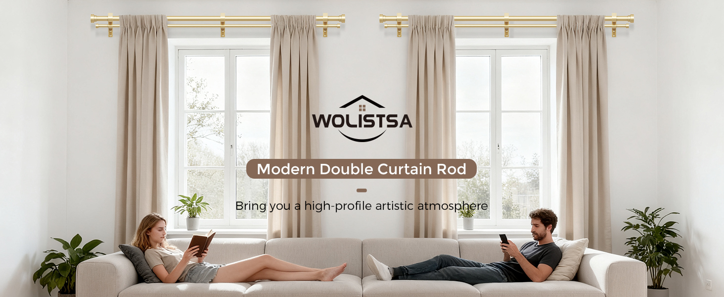 [GOLD DOUBLE CURTAIN ROD]: Wolistsa double curtain rods are crafted by professional designers, featuring a modern design that combines practicality with aesthetics. Unlike flimsy plastic finials, our modern finials use premium aluminum alloy, manually cut, meticulous grinding and multi-level polished, and adopt high-temperature curing coating, the surface is smooth, clean, round to create a perfect touch and texture with scratch-resistant