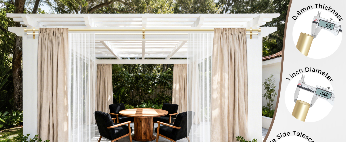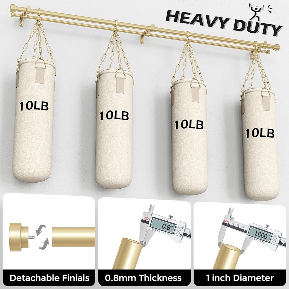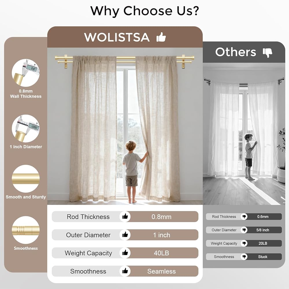 [STURDY AND DURABLE]: Built for strength, Wolistsa heavy duty double curtain rods are made of high quality carbon steel with a 0.5% carbon content. The double drapery rods have a 1" diameter front rod and 5/8" back rod with a 0.8mm wall thickness including two premium mental ends that can hold up to 40 lbs. Compared to other 7/8" diameter front rod, 1/2" back rod and 0.5mm thickness double curtain rods for windows on the market, our dual curtain rod redefine "heavy duty" with stronger materials and thicker rods