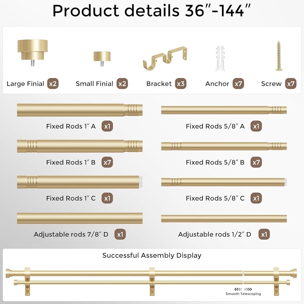[DOUBLE CURTAIN ROD SIZE SELECTION]: The Wolistsa curtain rod double features a single side telescoping sliding construction, maximum extension length of 36 to 153 inches(3 to 12.8 feet), applicable window lengths from 30 to 144 inches(2.5 to 12 feet). This double window rod package includes 18 fixed rods, 2 adjustable telescopic rod, 4 gold end cap finials, 3 brackets, 7 anchors, 7 screws