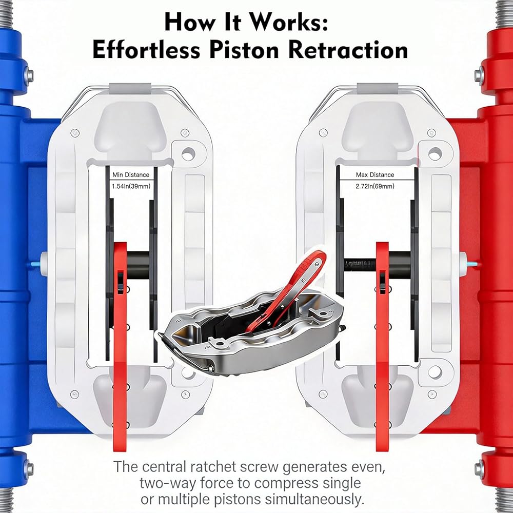 360° Ratcheting Mechanism: Smooth rotating ratchet handle allows one-handed operation to compress caliper pistons evenly and quickly, much faster and safer than traditional C-clamps