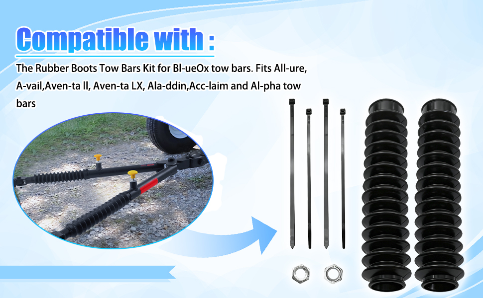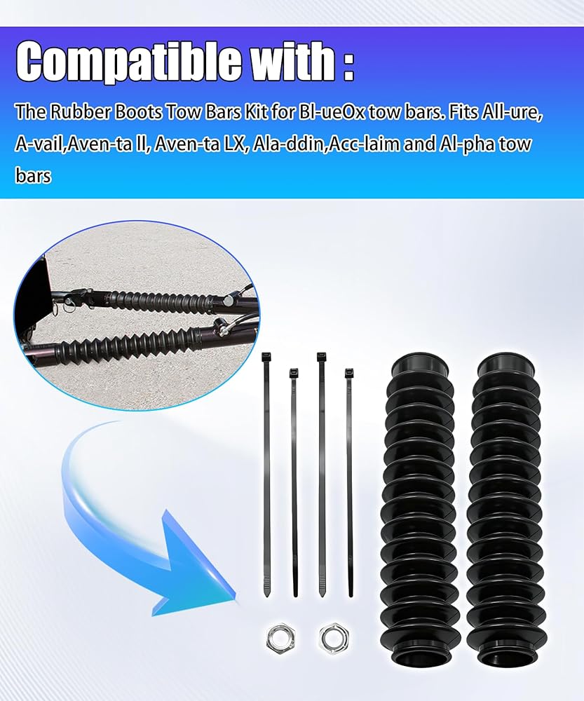 [Replacement kit compatible model]:Replacement rubber boots for Blue Ox tow bars. Fits Avail, Aventa II, Allure, Aventa LX, Aladdin, Acclaim and Alpha tow bars. Keeps the elements out of tow bar. Pack of 2