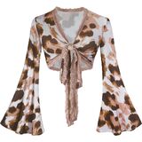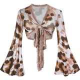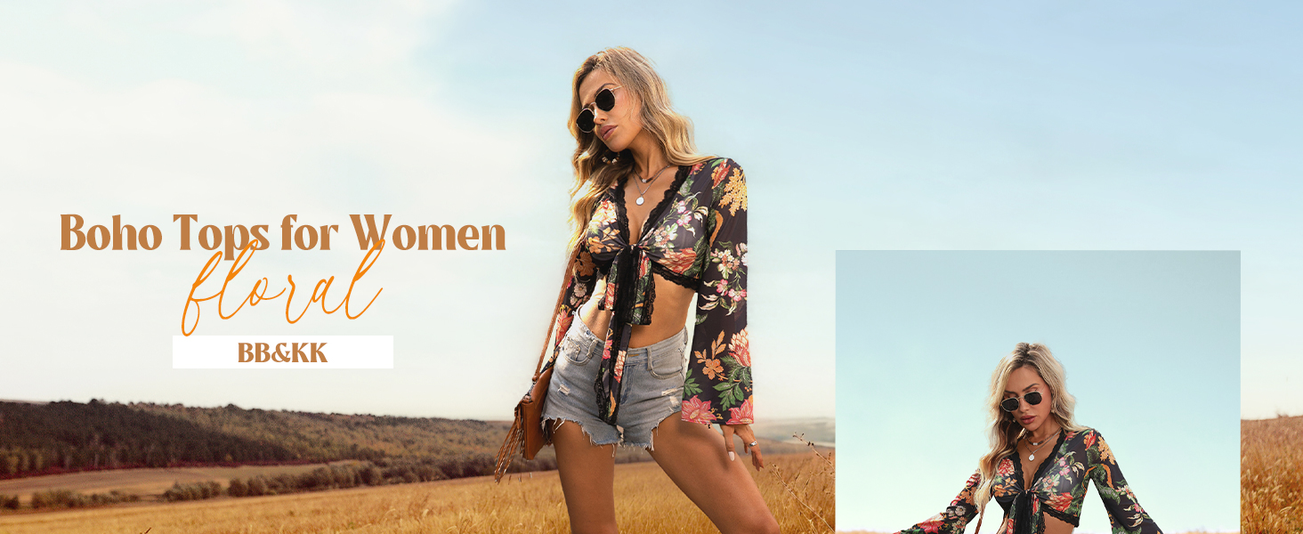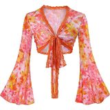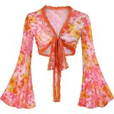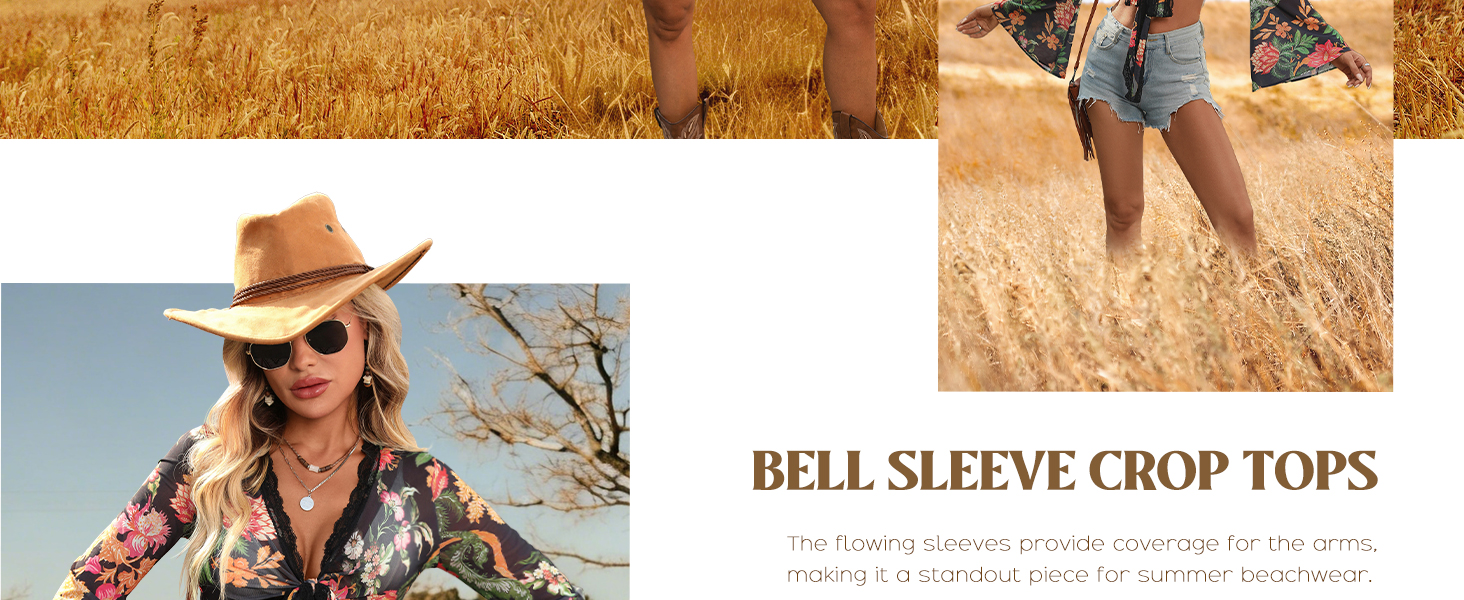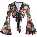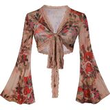 Women Boho Wrap Tops Tie Front Bell Sleeve Mesh Crop Blouse Shirt Floral Print 70s Outfit for Rave Music Festival Disco Party