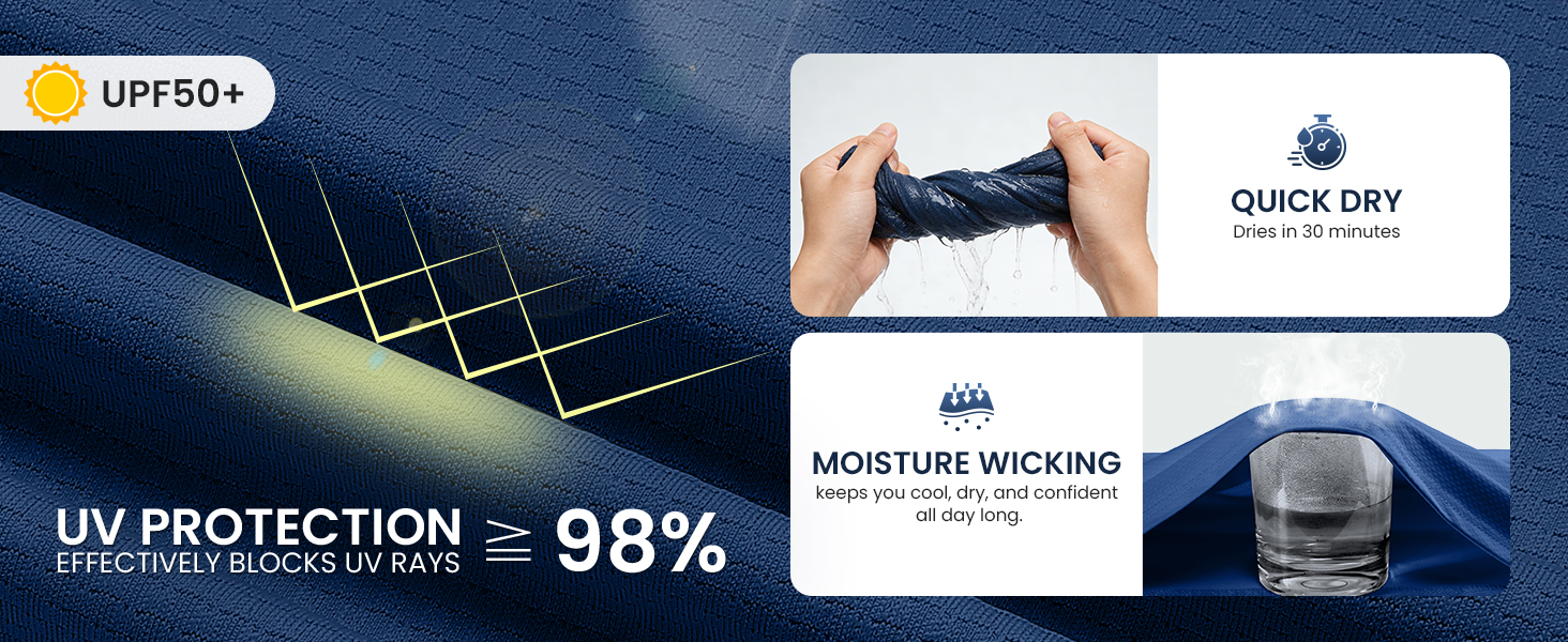 Premium Performance Fabric: Crafted from a high-quality UPF 50+ sun protection 85% polyester and 15% spandex blend, these Moisture-wicking Golf Polo Shirts offer a silky-soft texture that is lightweight and extremely breathable. Enjoy ultimate comfort with moisture-wicking and quick-dry technology, keeping you cool and confident throughout any activity.