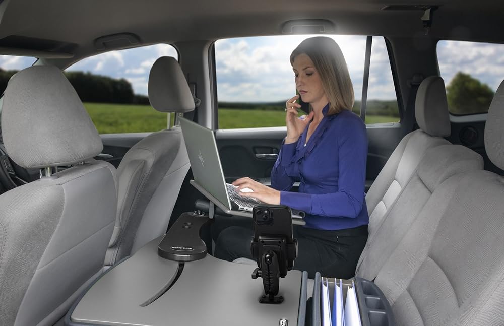 The Reach Vehicle Desk is the most ergonomic work solution on the market. The car desk has a slide out arm that extends the work tray another 23″ from the edge of the desk, providing an extra-long “reach” over to the mobile worker. The tray comes with a non-slip pad, providing extra security so the laptop or tablet with keyboard won't move around while working. There is an additional security strap for a laptop or a tablet with a built-in keyboard. Keep all of your valuables safe with the hidden storage space located beneath the desk work surface. Staying organized and securing loose items is important to the mobile worker and securing your office essentials improves productivity and reduces distractions. The Reach Desk Back Seat comes with a support rod for secure placement.