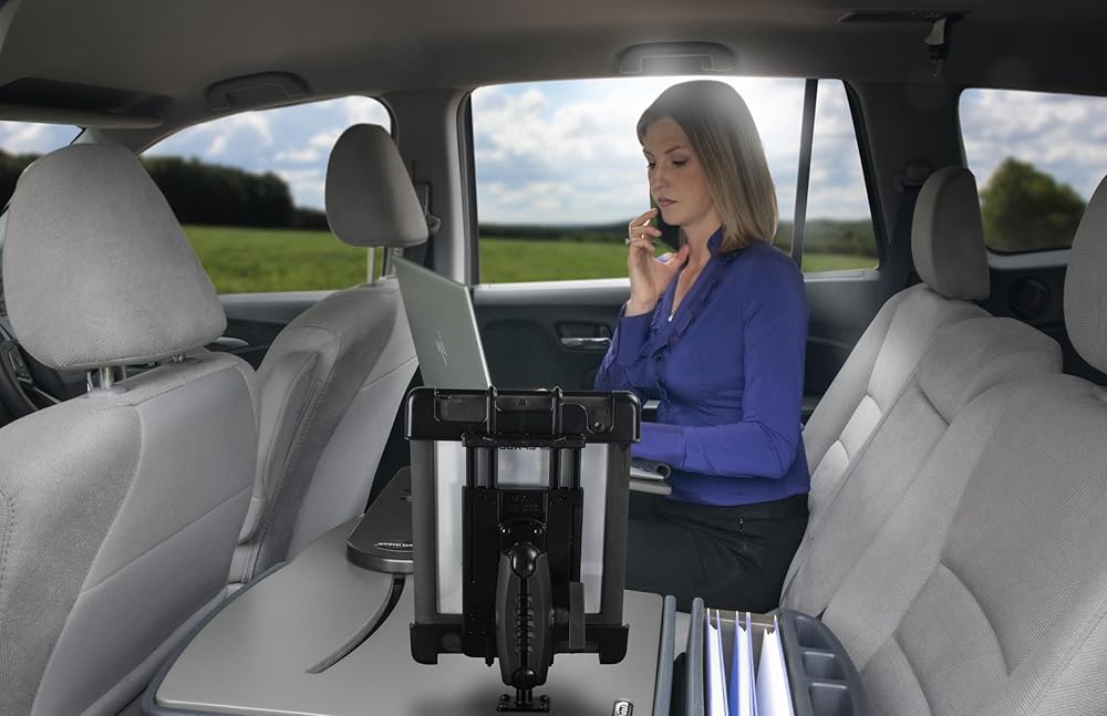 The Reach Vehicle Desk is the most ergonomic work solution on the market. The car desk has a slide out arm that extends the work tray another 23″ from the edge of the desk, providing an extra-long “reach” over to the mobile worker. The tray comes with a non-slip pad, providing extra security so the laptop or tablet with keyboard won't move around while working. There is an additional security strap for a laptop or a tablet with a built-in keyboard. Keep all of your valuables safe with the hidden storage space located beneath the desk work surface. Staying organized and securing loose items is important to the mobile worker and securing your office essentials improves productivity and reduces distractions. The Reach Desk Back Seat comes with a support rod for secure placement.