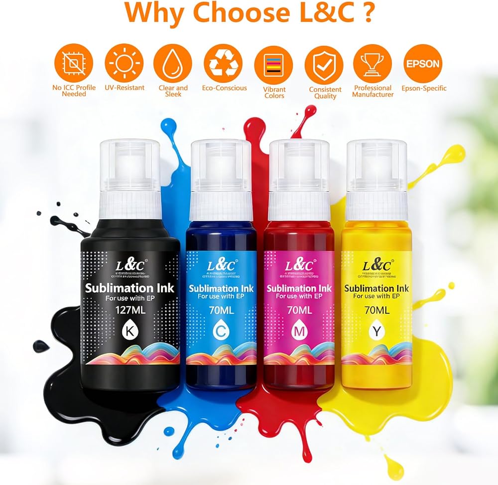 Vibrant, Fade-Proof Colors & Clog-Free Performance – Our Sublimation Ink, crafted as premium sublimation ink for epson, brings eye-catching, intense hues that make your creations stand out! This water-based formula delivers smooth, even layers with enhanced color density, ensuring vivid results that resist fading and stay bright even after multiple washes or long-term use. The premium blend prevents printhead clogs, saving you time on maintenance and ensuring consistent, high-quality prints every time