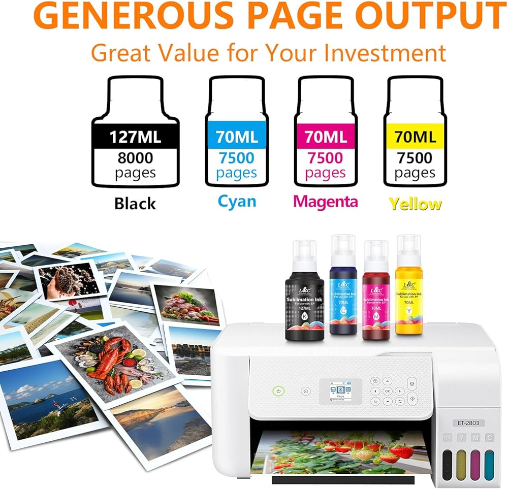 Unmatched Compatibility with EPSON Printers – Designed exclusively for EPSON models, this sublimation ink works seamlessly with almost all popular series. EcoTank: ET-2800 ET-15000 ET-2803 ET-2850 ET-2400 ET-2720 ET-2760 ET-2850 ET-2840 ET-3830 ET-3850 ET-3843 ET-3700 ET-3710 ET-3750 ET-3760 ET3600 ET-4800 ET-4850 ET-4700 ET-4750 ET-4760 ET-5800 ET-5850 ET-5880 ET-5150 ET-5180 ET-7700 ET-7720 ET-7750 ET-5170 ET-16600 ET-16650 ect