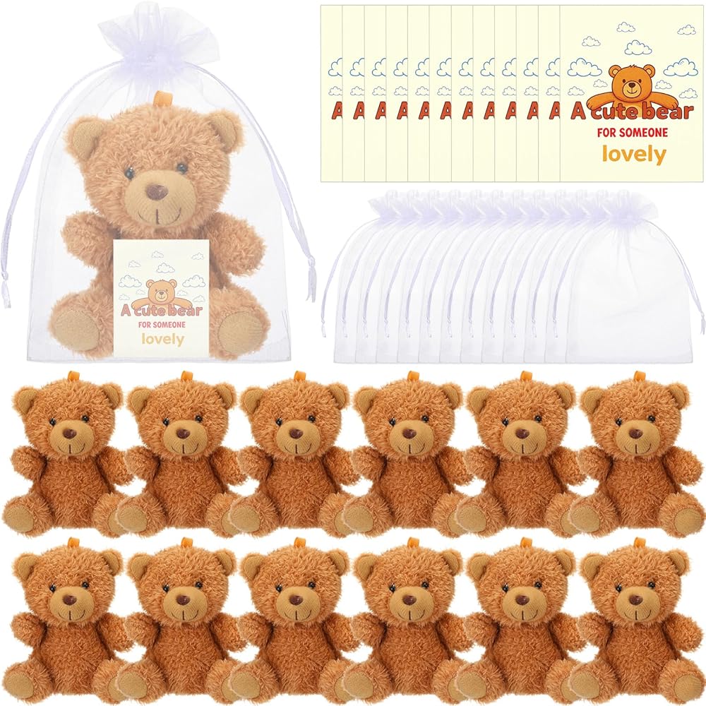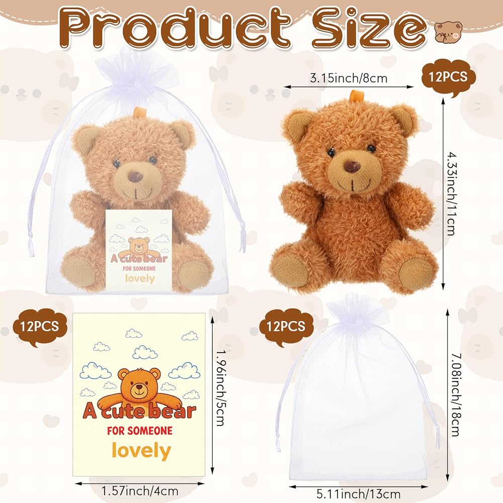 12 Sets Mini Plush Bears Bulk with Organza Gift Bags Message Cards, Brown Bear Keychains Party Favors for Birthday, Baby Shower, Prizes, Goodie Bag Stuffers, Small Gifts