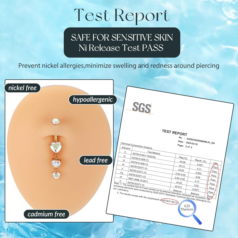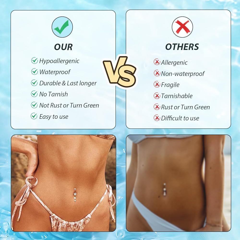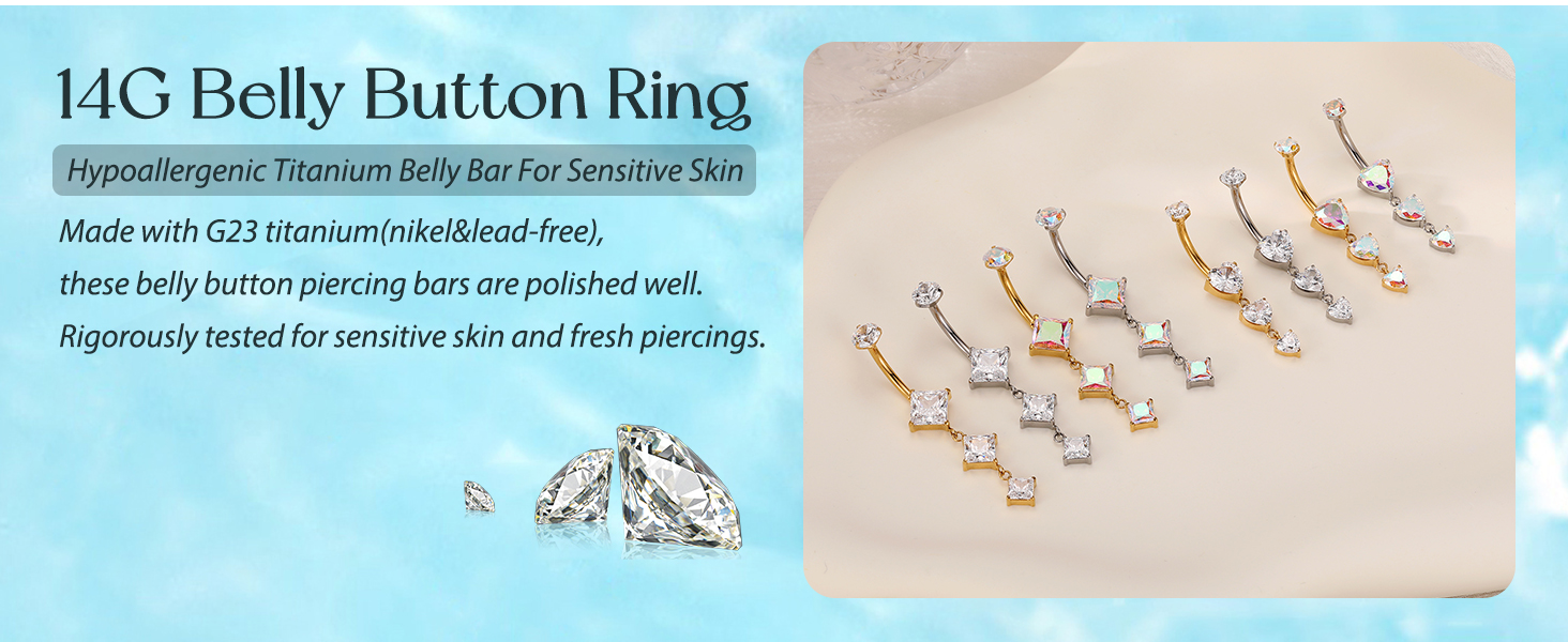 Material: Belly button ring crafted in grade 23 solid titanium,the grade of steel is top of the line.Hypoallergenic and shiny,this belly button ring is nickel-free, lead-free, and safe for sensitive skin. The belly ring with AAAAA+ CZ gemstone,lightweight and durable, ideal for everyday wear or summer beach fun