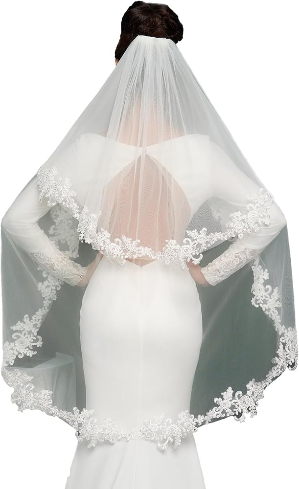 Elawbty 2 Tier Fingertip Length Lace Wedding Bridal Veil with Comb for Bride