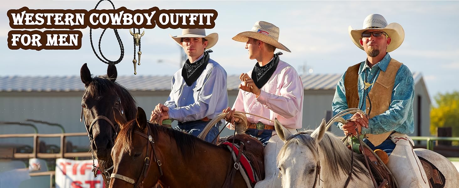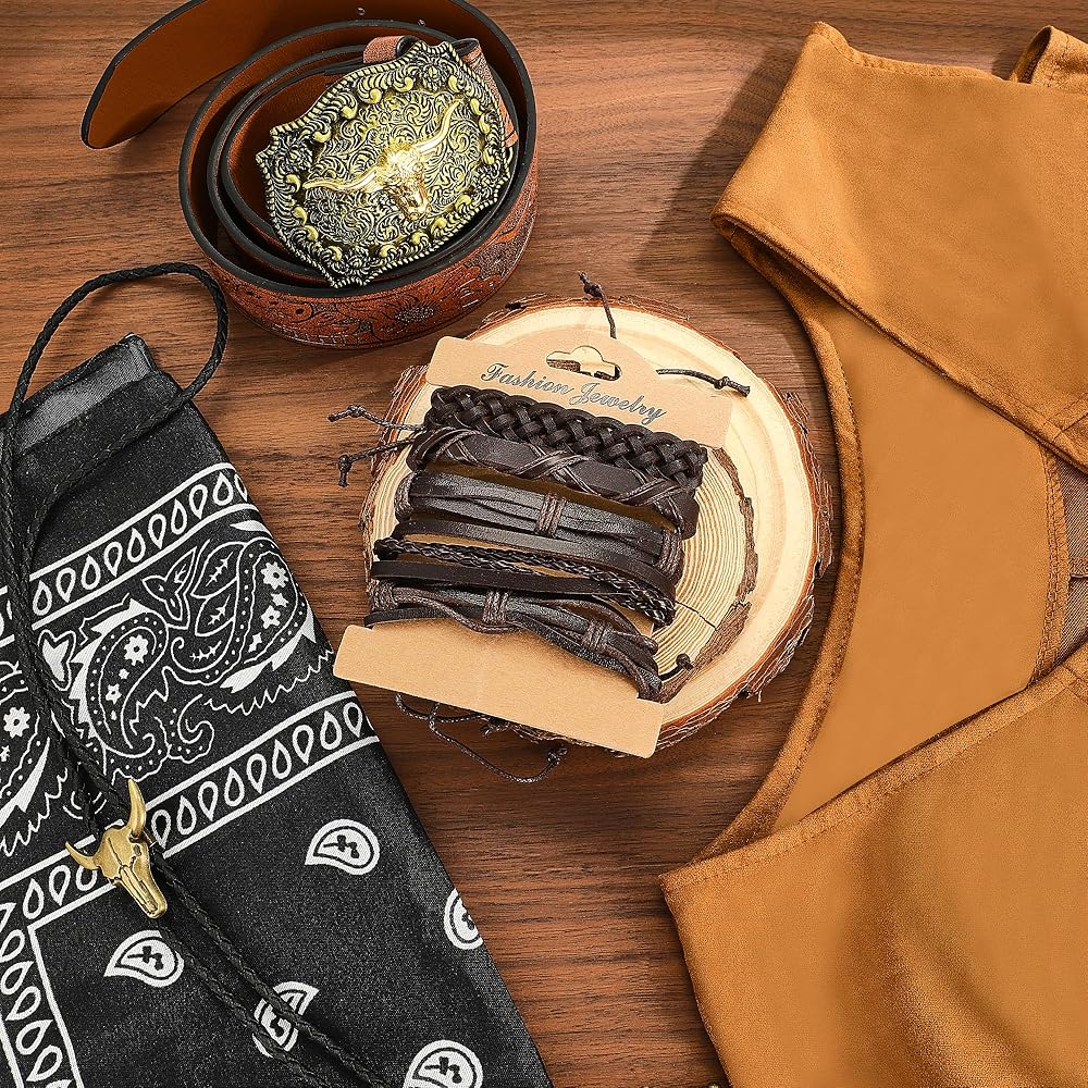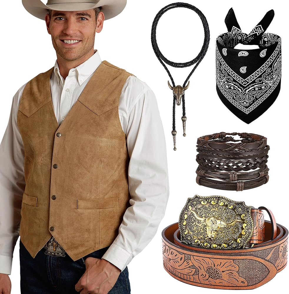 Cowboy Outfit: Our western cowboy outfit includes 1 cowboy vest for men, 1 cowboy buckle belt, 1 western vintage bolo necktie, 1 paisley bandana and several leather bracelets. Unleashing your inner cowboy charm and fulfilling your frontier fantasy