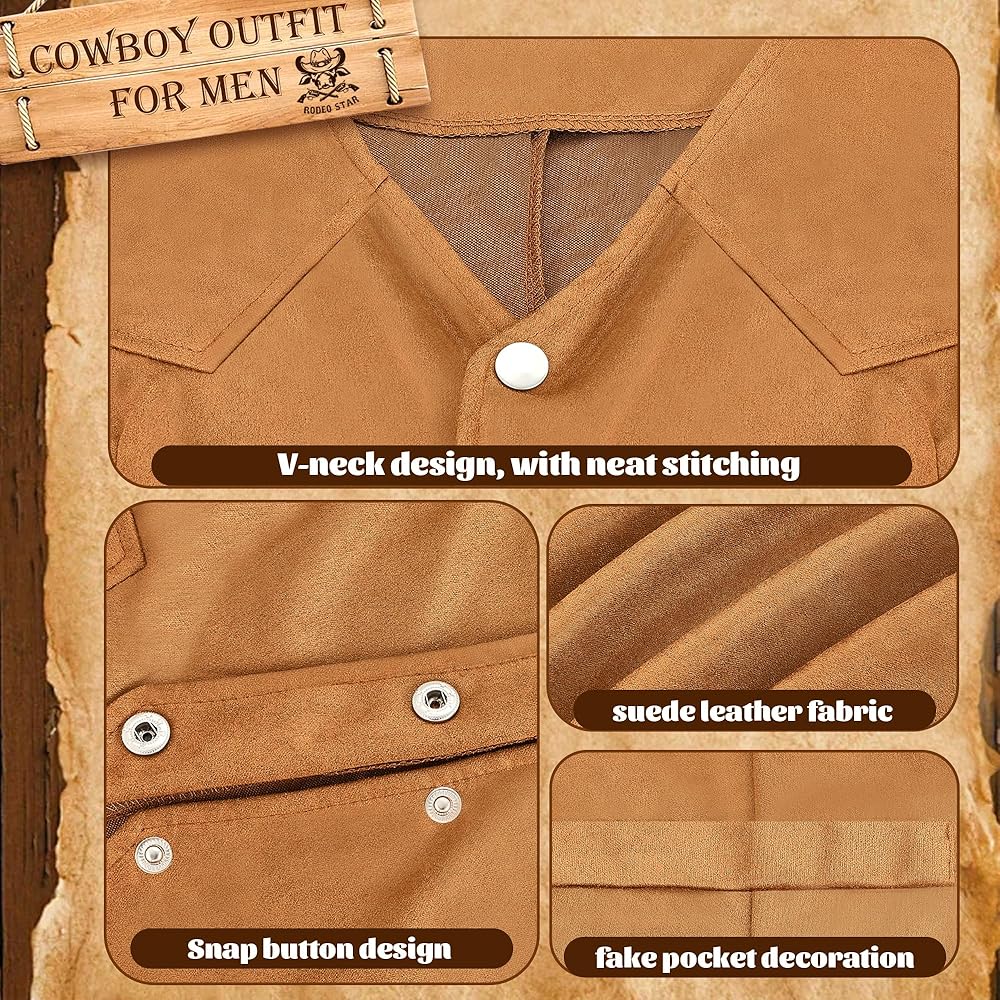 Cowboy Costume: Western cowboy vest is made from soft faux suede fabric, which is light and breathable, durable and comfortable to wear. Men western cowboy belt and vintage bolo necktie are made of alloy and leather, with fine workmanship and durability. Cowboy belt buckle is crafted from quality Alloy with intricate engravings that add to the classic western appeal