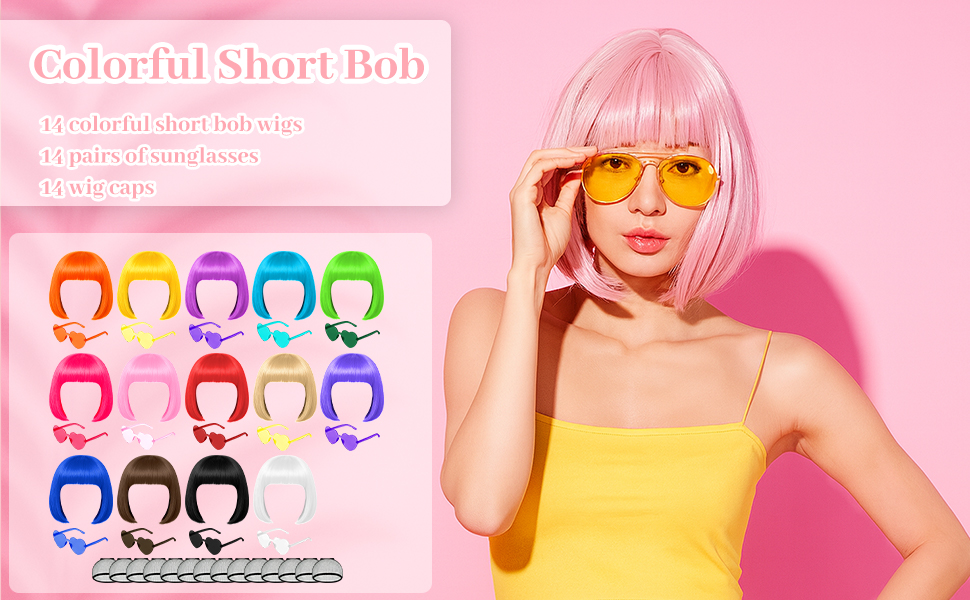 42 Pcs Short Bob Wigs Sunglasses and Wig Caps, Colorful Party Wigs Neon Cosplay Hairpieces for Women Birthday Halloween Bachelorette Party - 14 Bright Colors