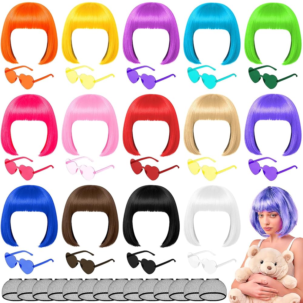 Great Value Set: You will receive 14 colorful short bob wigs, 14 wig caps, and 14 pairs of heart-shaped sunglasses — a total of 48 pieces! Their vibrant colors and fun accessories will take your party atmosphere to the next level.