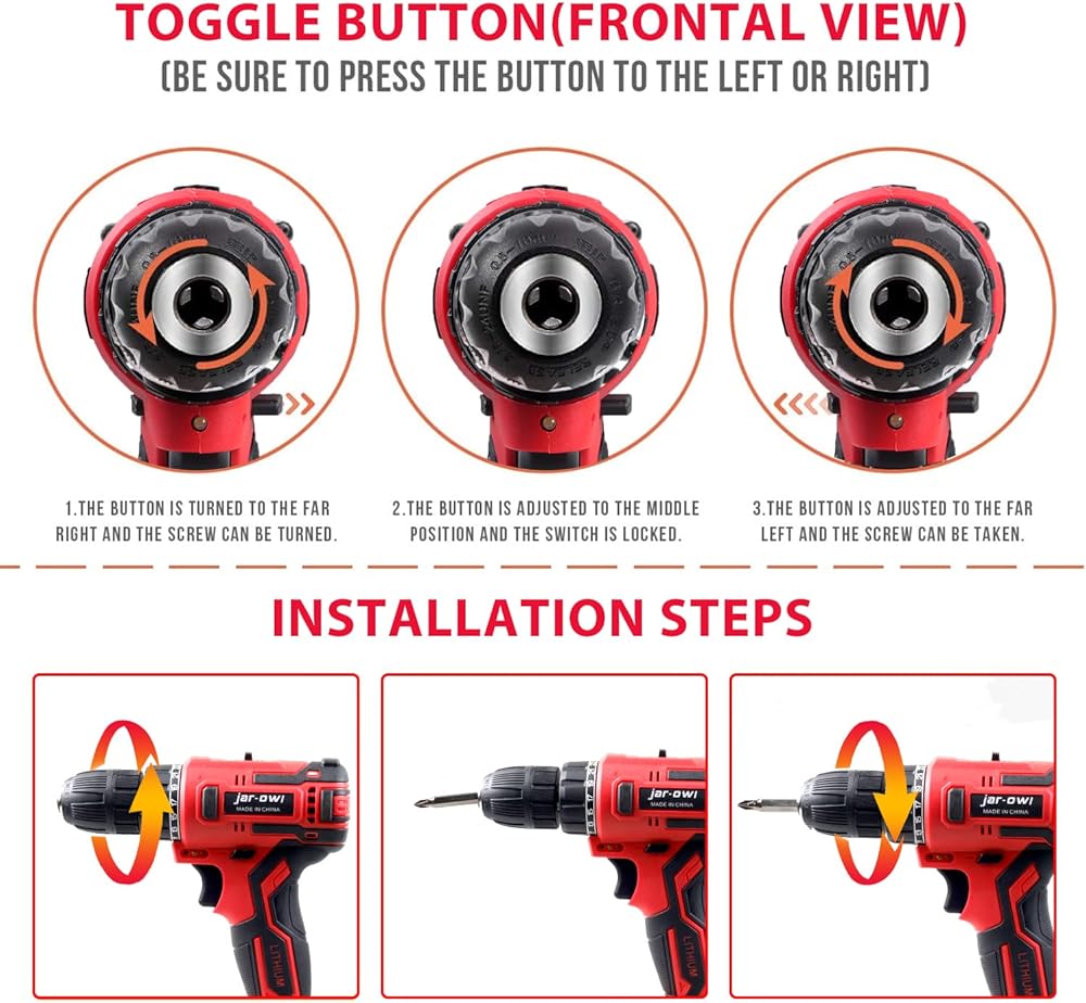 【3/8" KEYLESS CHUCK&VARIABLE TRIGGER】The electric drill has 10mm 3/8" keyless ratcheting chuck can hold the bits without falling off and stop working, make them good for general purpose drilling. Variable speed trigger allow you to select different speeds on the task at hand. A flexible shaft could be used in some places where driver bits are hard to reach. Cordless tool is perfect for home, household, garage, car trunk, mechanic projects and bike repair.