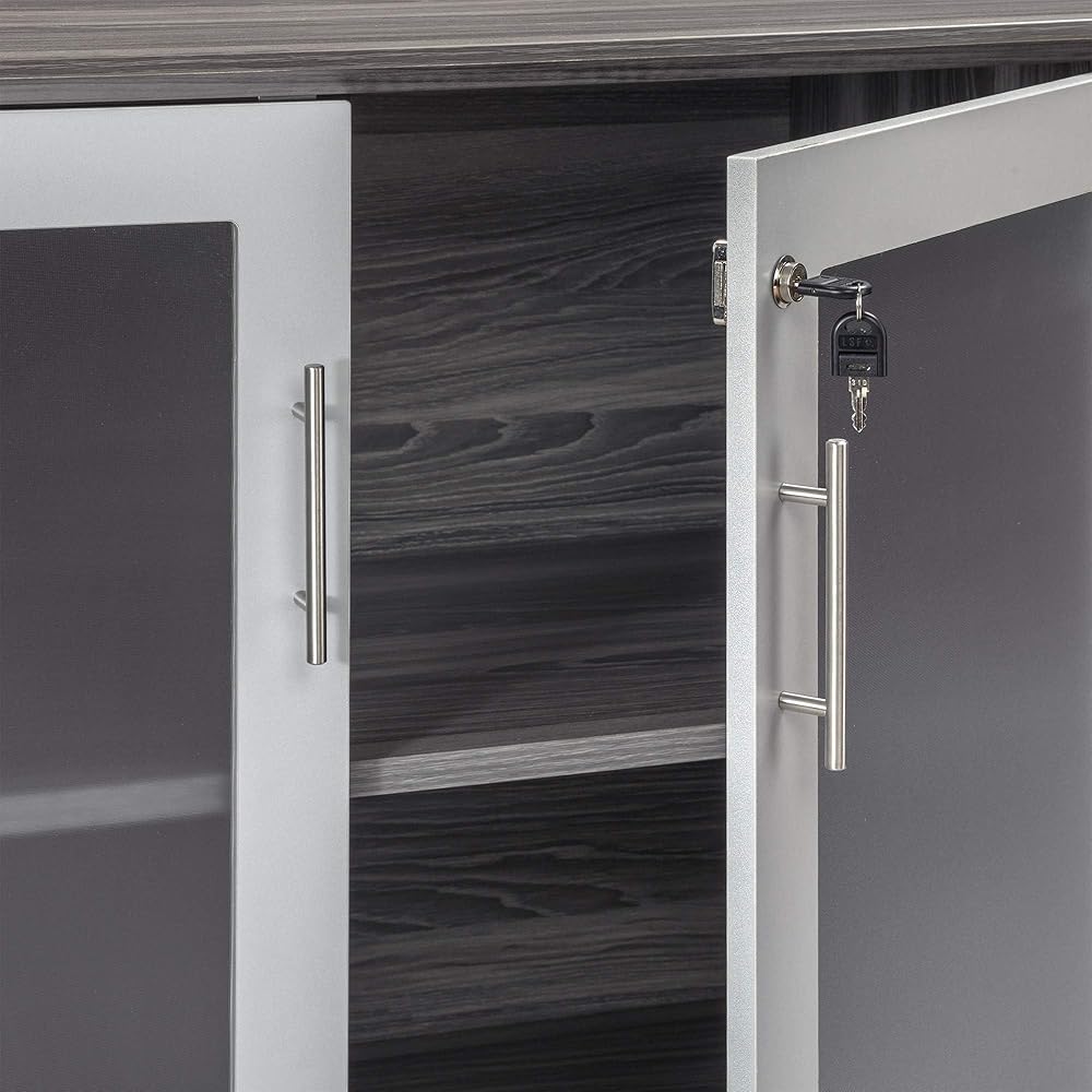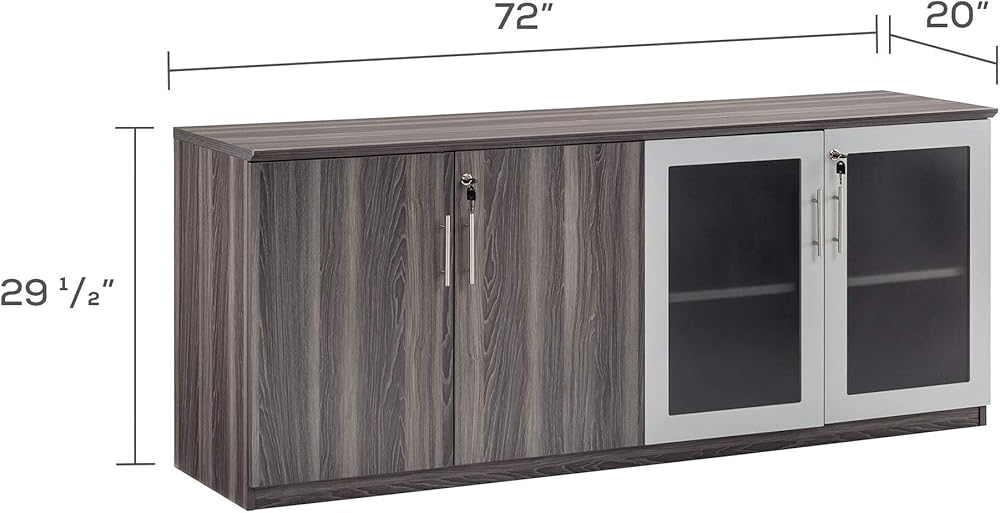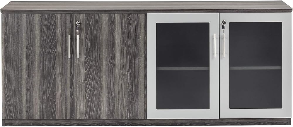 Scranton & Co Low Wall Cabinet with Doors (Wood-Glass Door Combination) in Gray Steel. Contemporary style, elegant functionality and exceptional value come together in the Series of laminate case goods. Clean lines, curved shapes and floating work surfaces reflect Italian design influences. A smartly edited array of components allows a tremendous range of workplace configurations. And all of this is delivered at an incredibly affordable price.