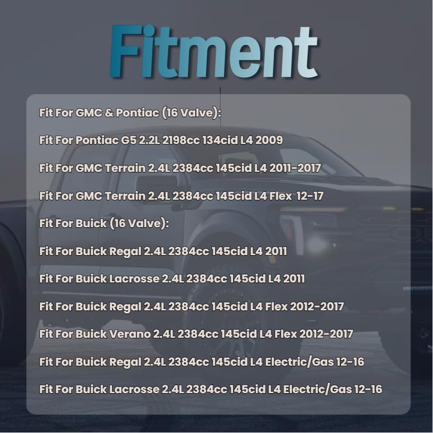 Fitment: Fit For GMC & Pontiac (16 Valve): Fit For Pontiac G5 2.2L 2198cc 134cid L4 DOHC 2009, Fit For GMC Terrain 2.4L 2384cc 145cid L4 DOHC 11-17, Fit For GMC Terrain 2.4L 2384cc 145cid L4 Flex DOHC 12-17, Fit For Buick (16 Valve): Fit For Buick Regal 2.4L 2384cc 145cid L4 DOHC 2011, Fit For Buick Lacrosse 2.4L 2384cc 145cid L4 DOHC 2011, Fit For Buick Regal 2.4L 2384cc 145cid L4 Flex DOHC 2012-2017, Fit For Buick Verano 2.4L 2384cc 145cid L4 Flex DOHC 2012-2017, Fit For Buick Regal 2.4L 2384cc 145cid L4 Electric/Gas DOHC 12-16, Fit For Buick Lacrosse 2.4L 2384cc 145cid L4 Electric/Gas DOHC 12-16