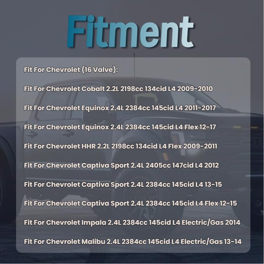 Fitment: Fit For Chevrolet (16 Valve): Fit For Chevrolet Captiva Sport 2.4L 2384cc 145cid L4 DOHC 2013-2015, Fit For Chevrolet Captiva Sport 2.4L 2384cc 145cid L4 Flex DOHC 12-15, Fit For Chevrolet Captiva Sport 2.4L 2405cc 147cid L4 DOHC 2012, Fit For Chevrolet Cobalt 2.2L 2198cc 134cid L4 DOHC 2009-2010, Fit For Chevrolet Equinox 2.4L 2384cc 145cid L4 DOHC 2011-2017, Fit For Chevrolet Equinox 2.4L 2384cc 145cid L4 Flex DOHC 12-17, Fit For Chevrolet HHR 2.2L 2198cc 134cid L4 Flex DOHC 2009-2011, Fit For Chevrolet Impala 2.4L 2384cc 145cid L4 Electric/Gas DOHC 2014, Fit For Chevrolet Malibu 2.4L 2384cc 145cid L4 Electric/Gas DOHC 13-14