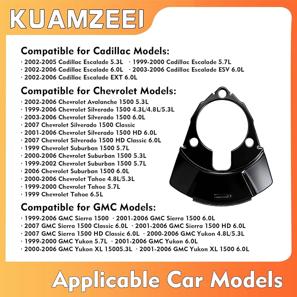 Important Note: While our vehicle compatibility chart is a helpful guide, it may not be 100% accurate. The OE numbers listed in our product details are guaranteed to be correct. If you know the OE number of the part you need, simply search by this number to ensure an exact match. Vehicle Fitment: Compatible with Cadillac Models: For Cadillac For Escalade 1999 2000 2002-2006 For Cadillac For Escalade ESV 2003-2006 For Cadillac For Escalade EXT 2002-2006 Compatible with GMC Models: For GMC Sierra 1500 1999-2006 For Yukon 2000-2006 For Yukon Xl 1500 2000-2006 For Chevrolet Avalanche 1500 2002-2006 Compatible with Chevrolet Models: For Avalanche 1500 2002-2006 For C1500 Suburban 1999 For Silverado 1500 1999-2006 For Silverado 1500 Classic 2007 For Suburban 1500 2000-2006 For Tahoe 2000-2006 Specification: Condition : Brand New Brake Type : DISC Color : Black Material : Cold Rolled Steel Position : Rear Left & Right (1x Rear Driver Side,1x Rear Passenger Side) Reference Part Number : 924236, 15181162, 15233109, 15716364 Package Quantity: A Set of Two Pieces disc brake backing plates
