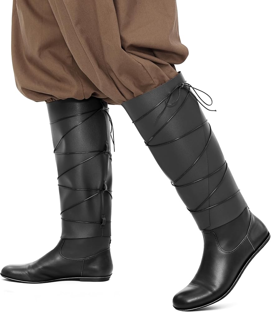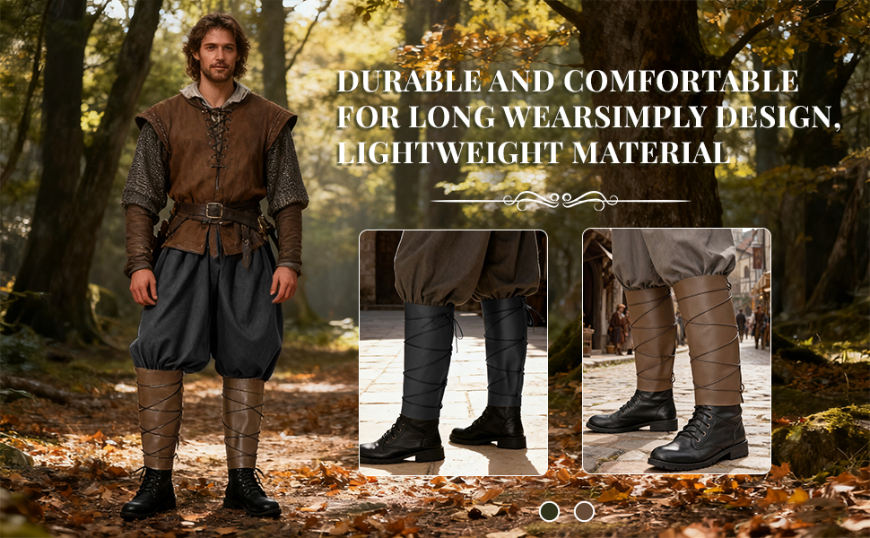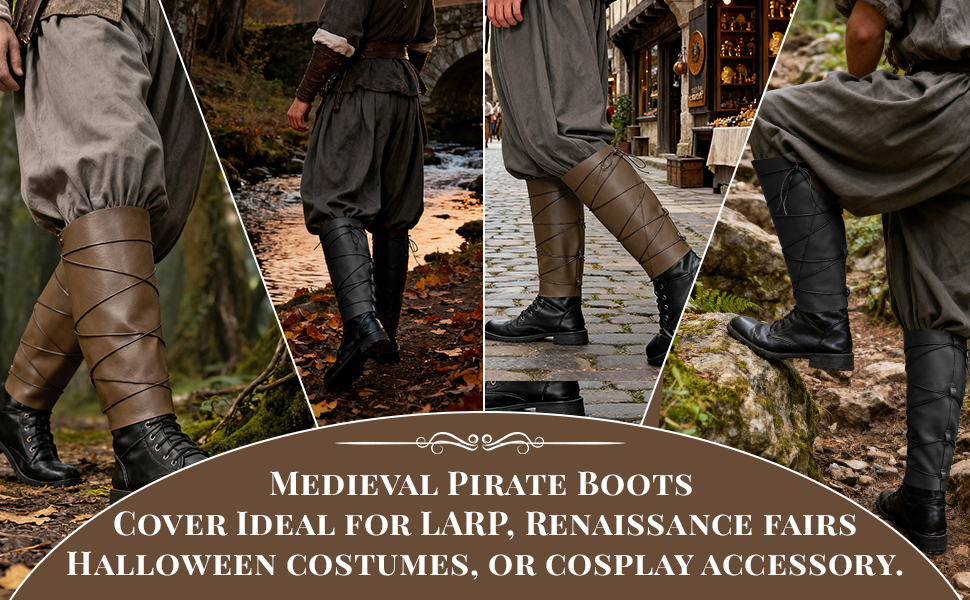 - Pirate Style: These medieval boot covers feature rugged faux leather construction with lace-up detailing for a pirate or Renaissance look.