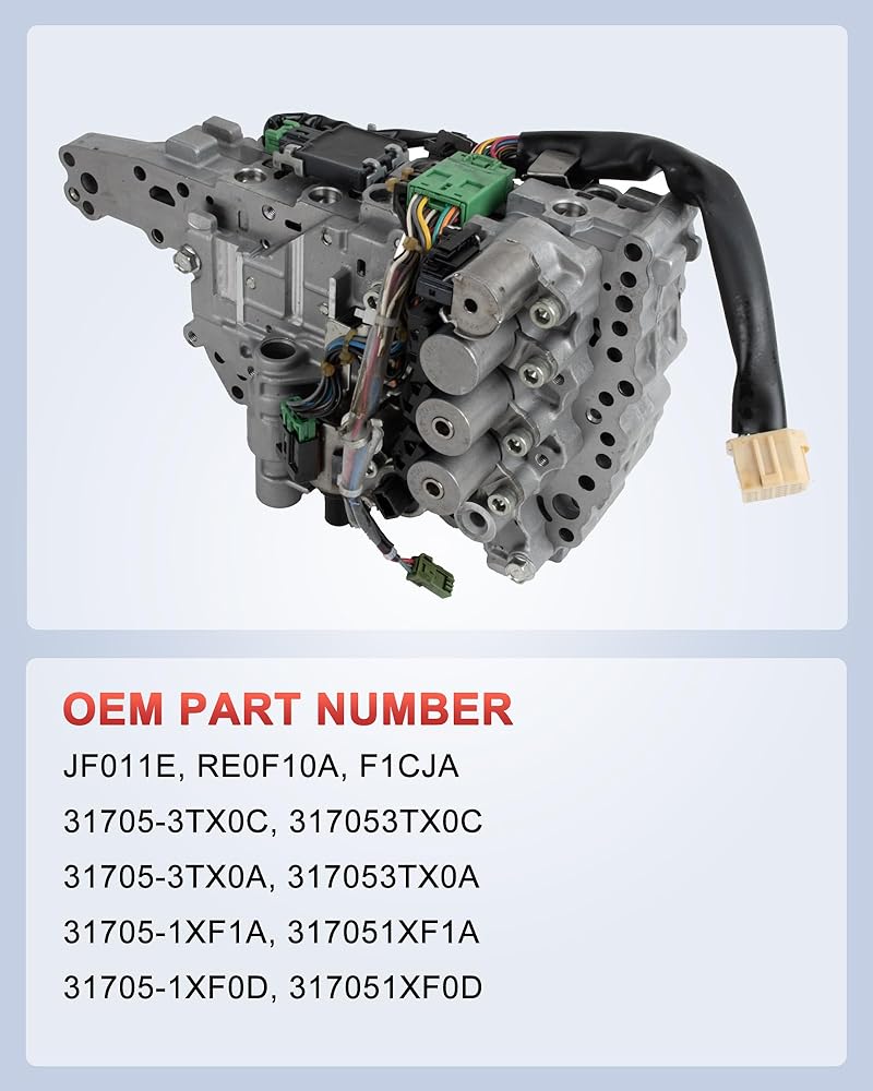 - OEM Part Number: JF011E, RE0F10A, F1CJA, 31705-3TX0C, 317053TX0C, 31705-3TX0A, 317053TX0A, 31705-1XF1A, 317051XF1A, 31705-1XF0D, 317051XF0D