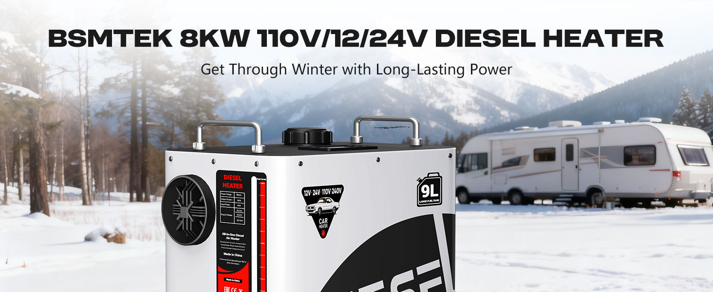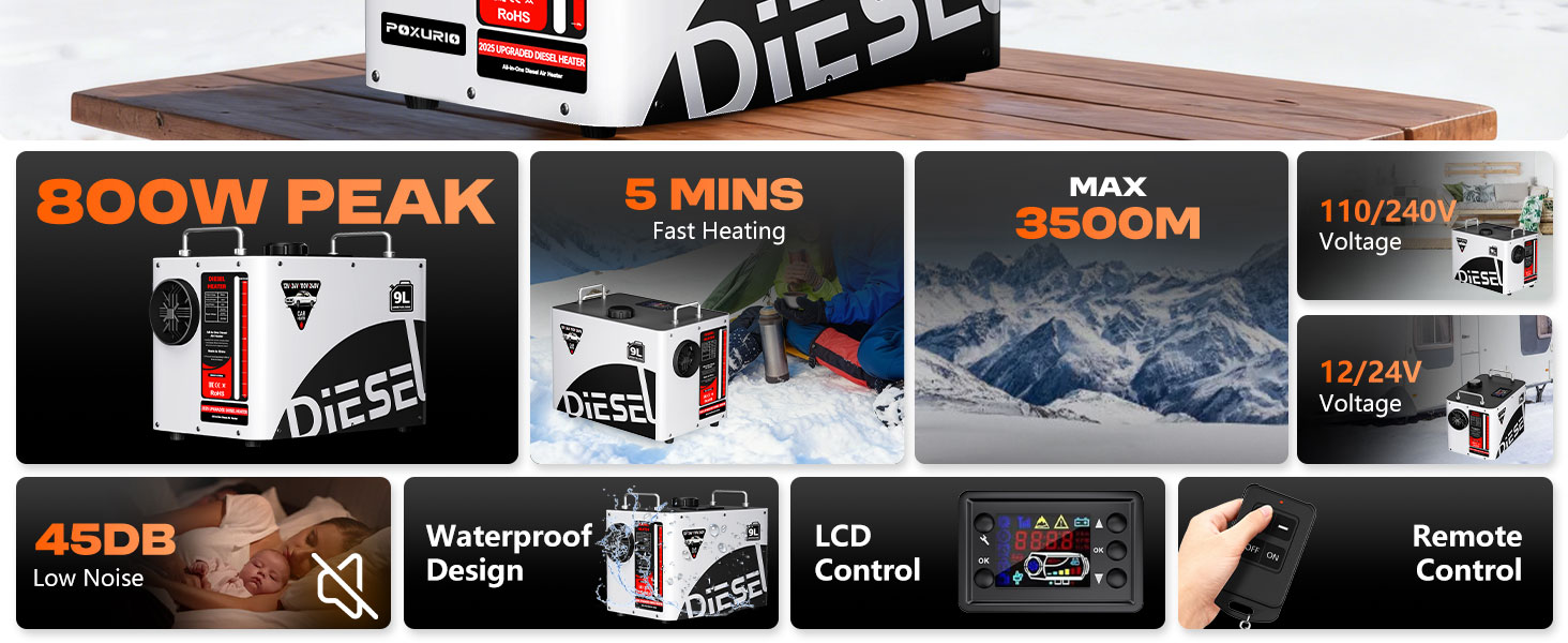 9L Diesel Heater Real Use Anywhere- POXURIO diesel heater not only supports 12V and 24V voltages but also includes a 100-125V adapter.You can plug the heater directly to 110 volts sockets. No fuss to buy extra parts and do the DIY work to use it in your garage or basement. Make you feel toasty in RV,car, camper,trailer, home, shop, basement etc in winter.