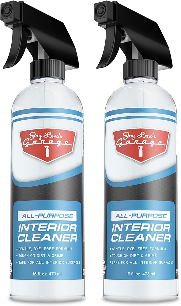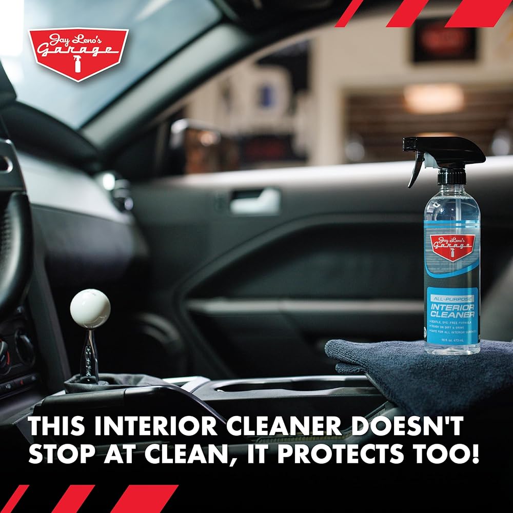 Jay Leno's Garage All Purpose Interior Cleaner is a versatile solution designed to clean and protect every surface inside your vehicle safely and effectively This professional grade interior cleaner works on leather vinyl plastic wood grain and sensitive navigation screens without causing discoloration or leaching dyes from delicate finishes making it ideal for cars trucks SUVs and motorcycles The gentle dye free formula quickly lifts dirt grime grease dust and other contaminants from interior surfaces leaving them clean refreshed and ready for detailing It helps maintain the natural color texture and appearance of leather vinyl and plastic while keeping delicate materials safe from damage Formulated with UV inhibitors this interior cleaner protects surfaces from harmful sun exposure helping prevent fading cracking and premature aging It is perfect for routine interior maintenance quick touch ups or complete detailing sessions providing professional grade results without harsh chemicals Jay Leno's Garage All Purpose Interior Cleaner is convenient and easy to use Simply spray onto the desired surface and wipe away dirt and grime with a microfiber towel or applicator The formula works quickly and efficiently leaving surfaces spotless smooth and protected Trusted by automotive enthusiasts and professional detailers this all purpose interior cleaner delivers consistent performance and protection for all types of vehicle interiors Its gentle yet effective cleaning power makes it an essential part of any automotive detailing routine ensuring interiors look new and feel refreshed every time