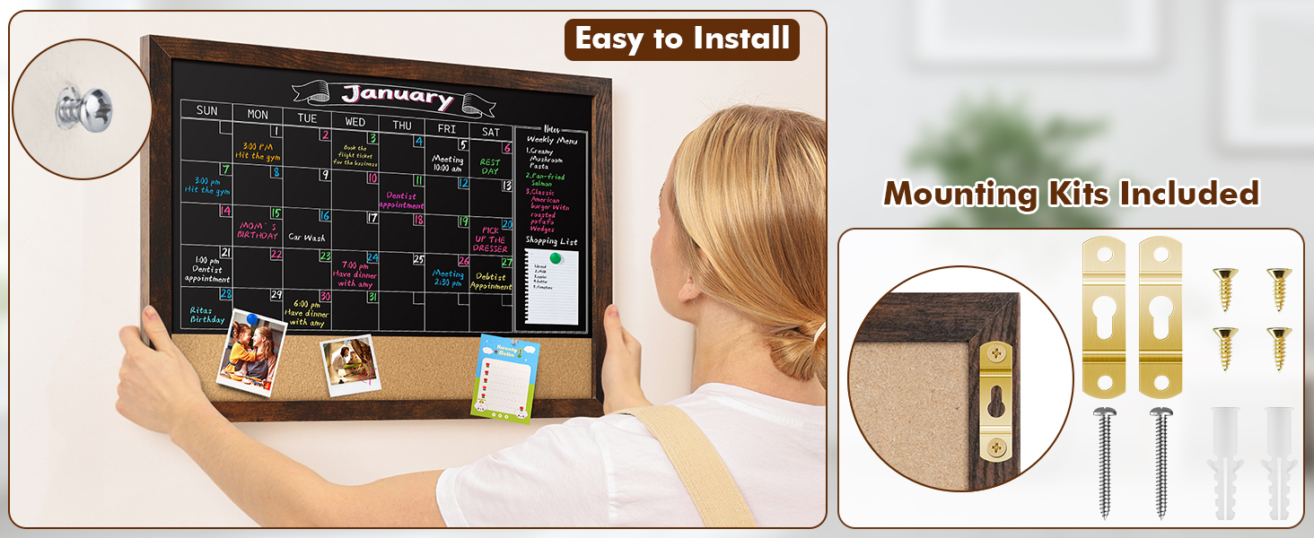 ✅ Perfect 18"x24" Size & Easy Installation – This wall mounted chalkboard calendar's 18"x24" dimension balances space and practicality: roomy enough to map out monthly plans as a calendar chalkboard, yet compact for small walls. All fixing kits are included, allowing free adjustment of hanging height for a custom fit as your go-to chalk board calendar.