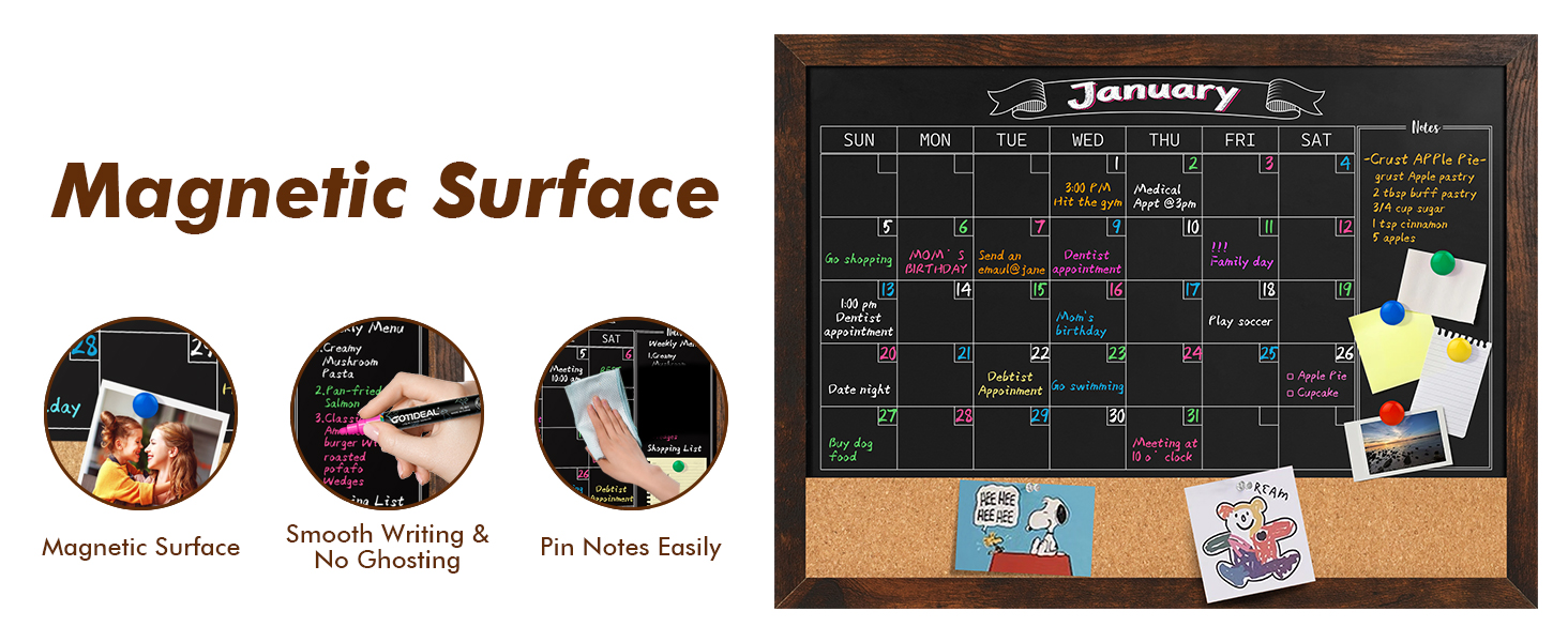 ✅ Smooth Writing & Stain-Free Reuse – The 100% non-porous surface of this magnetic chalkboard calendar ensures effortless writing with 4 colored liquid chalk markers (white/blue/green/pink) or traditional chalk. Erase cleanly without ghosting or residue, making this black chalkboard calendar a long-lasting, eco-friendly chalk calendar board for wall that stays crisp with every use.