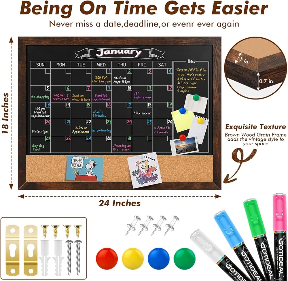 ✅ Ready-to-Use Accessory Kit – No extra purchases needed! The package comes with 1 x 18"x24" magnetic chalkboard calendar, 4 liquid chalk markers, 4 magnets, 4 pushpins, and all necessary mounting hardware. The durable frame ensures reliable daily use for your chalkboard calendar for wall, and our team is always available if you have any questions.