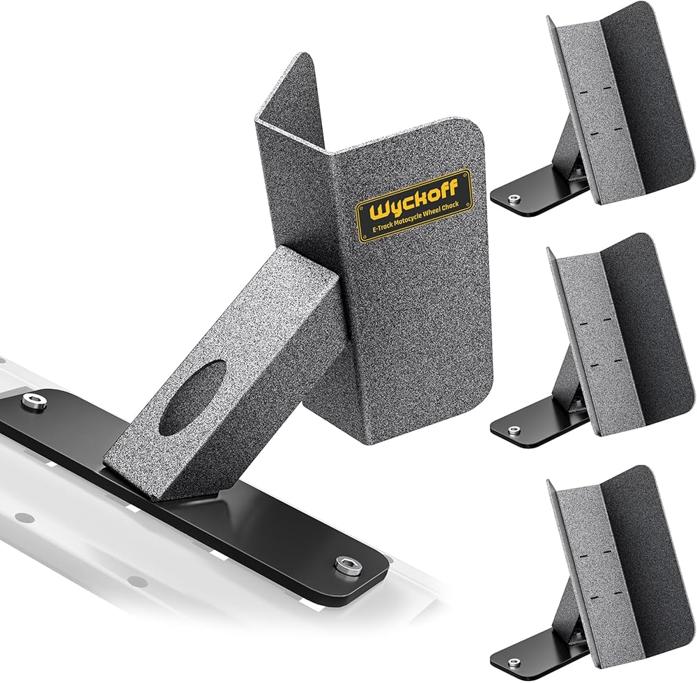 What's in the box: Includes 4 dirt bike wheel chock, 4 E-Track mount, plus 8 outer screws and 4 inner screw for the mount, 4 flat washer and 4 spring washer, product instructions