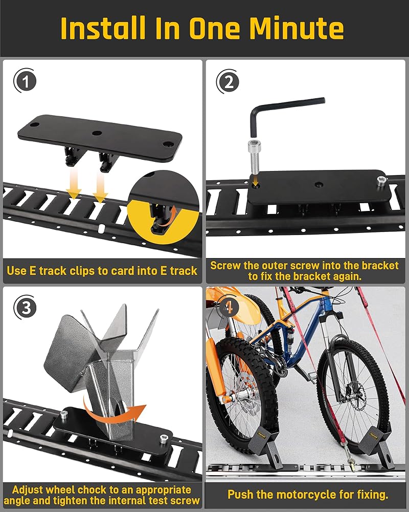 Under 1-Minute Install & Easy Repositioning: Clip the included E-track clips onto your E-track rail, tighten the screws to secure the base, adjust to your fit angle, and tighten the inner screw to lock e track wheel chock—installs or repositions in under 1 minute to fit different bike spacing in your trailer
