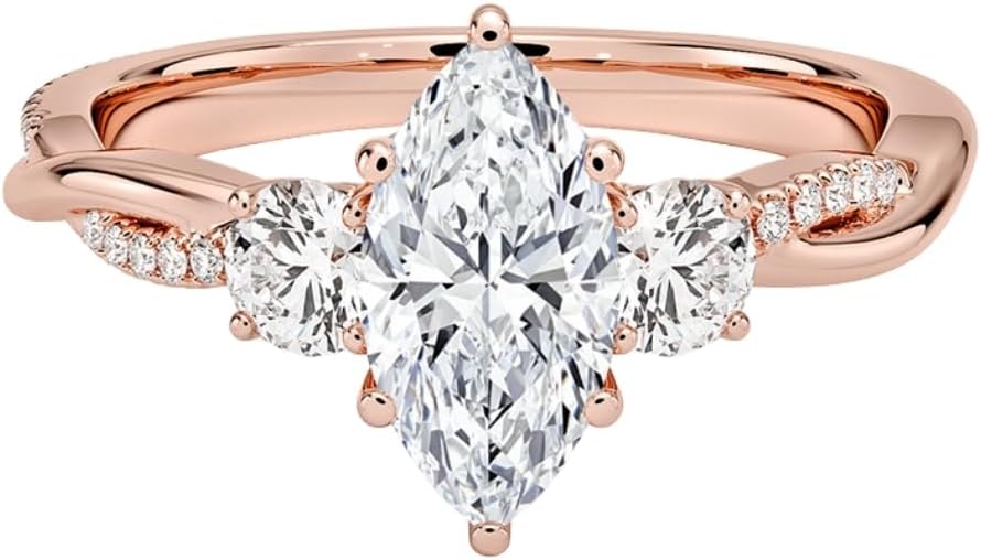 STONE DETAILS : Main Stone: Moissanite Main Stone shape :Marquise Brilliant Cut, Main Stone Weight: 1-5 carat Approx. Main Stone Color: Colorless, Main Stone Clarity: VVS, Main Stone Luster: Excellent, Side Stone : Round Cut, Stone Color/Clearity : White/VVS1, Side Stone Weight : 0.08 CT Approx.