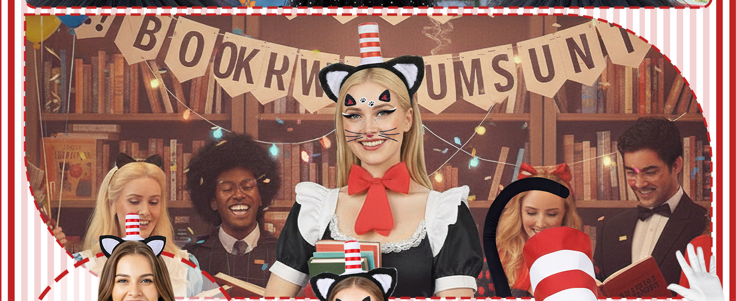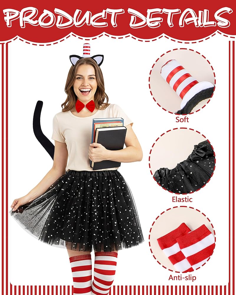 Funny Style: This cat costume brings the red-and-white top hat headband and playful accessories to life, creating a fun, recognizable look that's suitable for school celebrations, Halloween parties, and themed cosplay gatherings