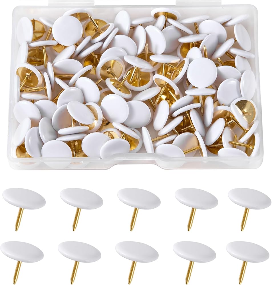 A. Each thumb tack is thoughtfully constructed with a steel core coated in gold for durability, paired with a smooth white plastic cap that combines functionality with a clean, versatile look. The 10 mm / 0.4 inches flat head offers a secure grip for easy pressing, while the 8 mm / 0.31 inches sharp steel tip glides through soft materials without bending, making insertion and removal hassle-free for all users.