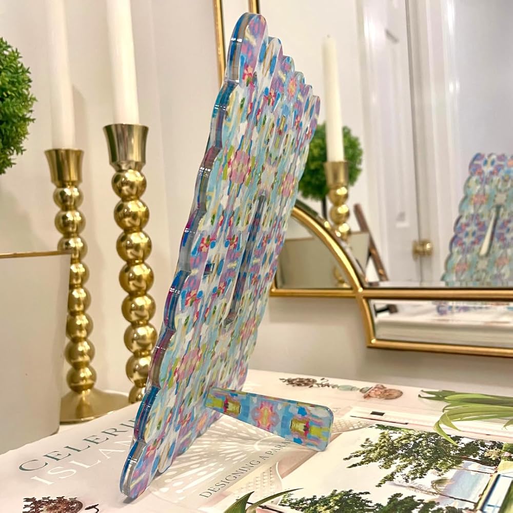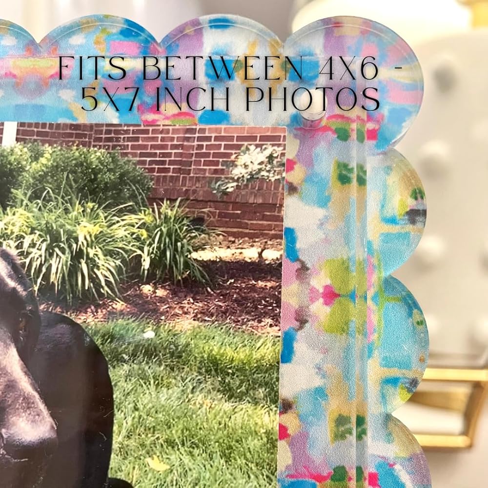 Bring color, charm, and personality to any space with this Katie Romeo Designs Scalloped Magnetic Acrylic Frame. Designed with Katie's signature vibrant abstract art pattern with beautiful shades of magenta, cerulean blue, and green, this 5x7 frame turns your favorite photos into a piece of art. The double-sided magnetic design makes it easy to swap photos in seconds, while the clear acrylic and scalloped edges add a chic, polished touch that complements any decor style - from coastal and preppy to modern grandmillennial. Perfect for displaying on a desk, nightstand, entry table, or bookshelf, this frame also makes a thoughtful hostess, birthday, or holiday gift. Whether you're styling your home or gifting someone special, it's a beautiful way to showcase life's most joyful moments.