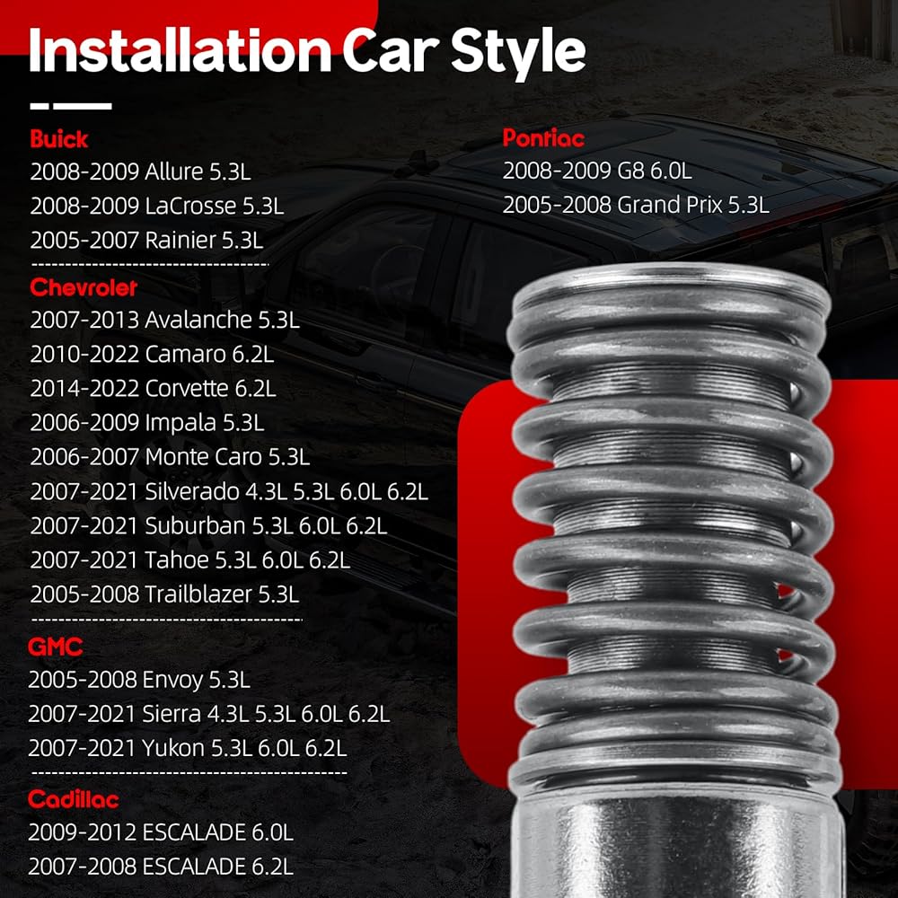 - Compatible With — for Buick 2008-2009 Allure 5.3L, 2008-2009 LaCrosse 5.3L, 2005-2007 Rainier 5.3L 丨 Compatible with Chevrolet 2007-2013 Avalanche 5.3L, 2010-2022 Camaro 6.2L, 2014-2022 Corvette 6.2L, 2006-2009 Impala 5.3L, 2006-2007 Monte Caro 5.3L, 2007-2021 Silverado 4.3L, 5.3L, 6.0L, 6.2L, 2007-2021 Suburban 5.3L, 6.0L, 6.2L, 2007-2021 Tahoe 5.3L, 6.0L, 6.2L, 2005-2008 Trailblazer 5.3L