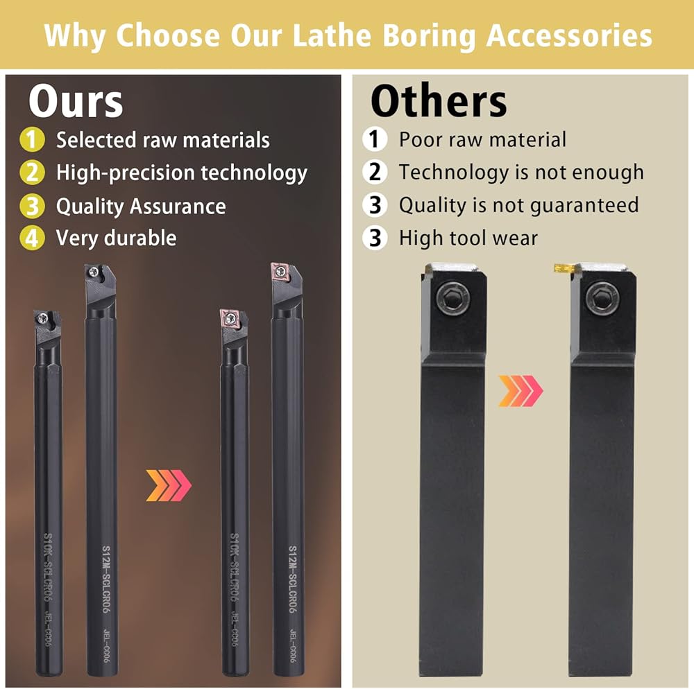 Metal Lathe Tools Includes:VerLich 4pcs SCLCR lathe boring bar set(S12M-SCLCR09/SCLCR1212H09/SCLCL1212H09/SCMCN1212H09), 10pcs CCMT09T304 Inserts, 4pcs T15 Wrenches. Comes with individual package, packed in Plastic box with Size mark on the box.