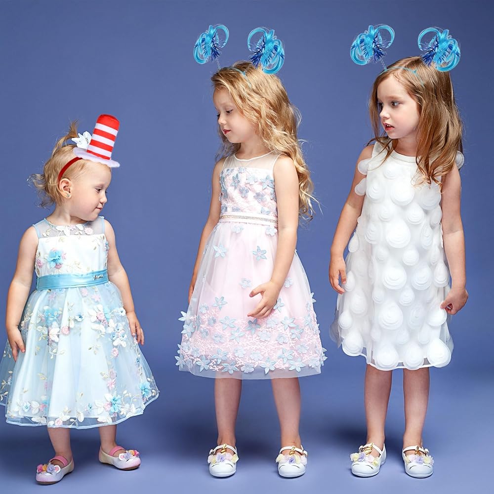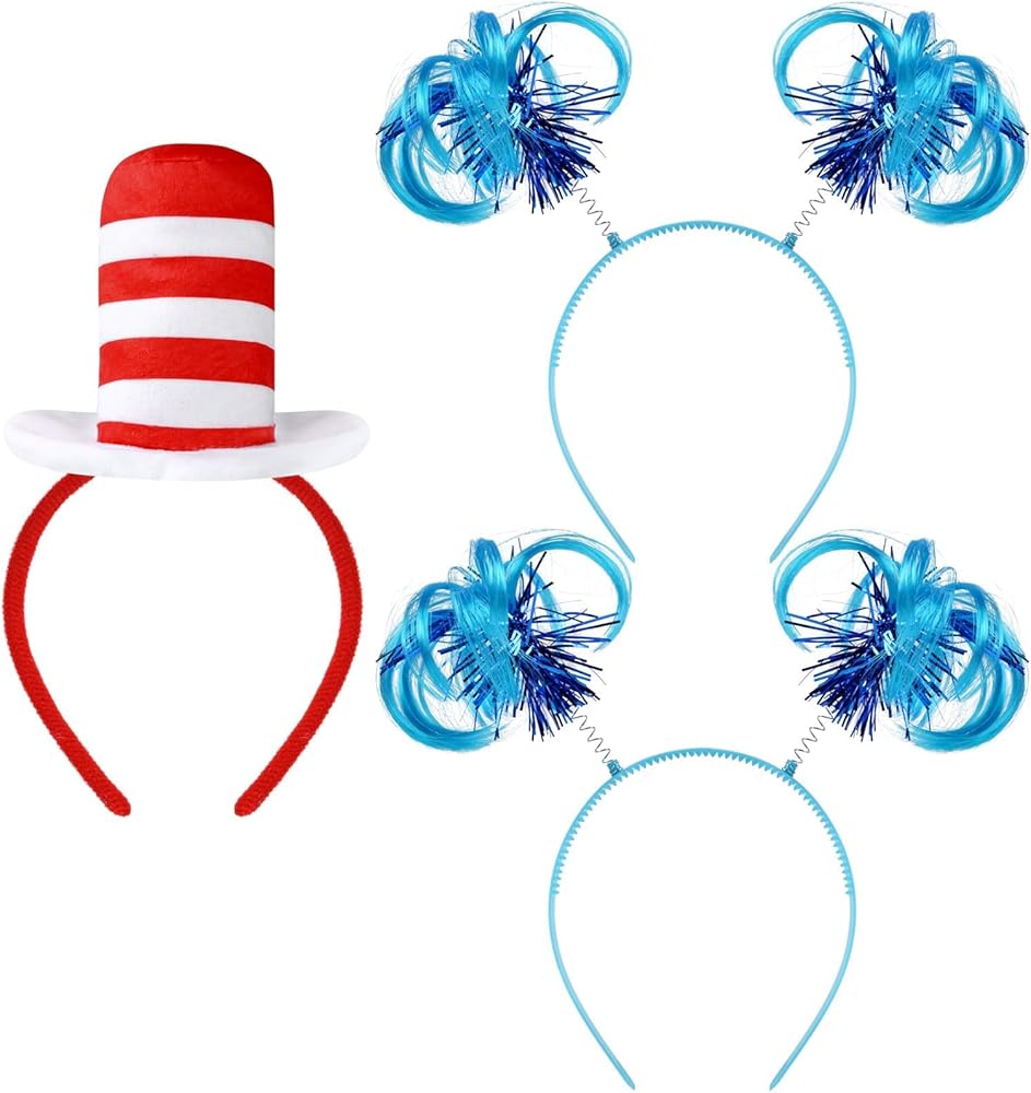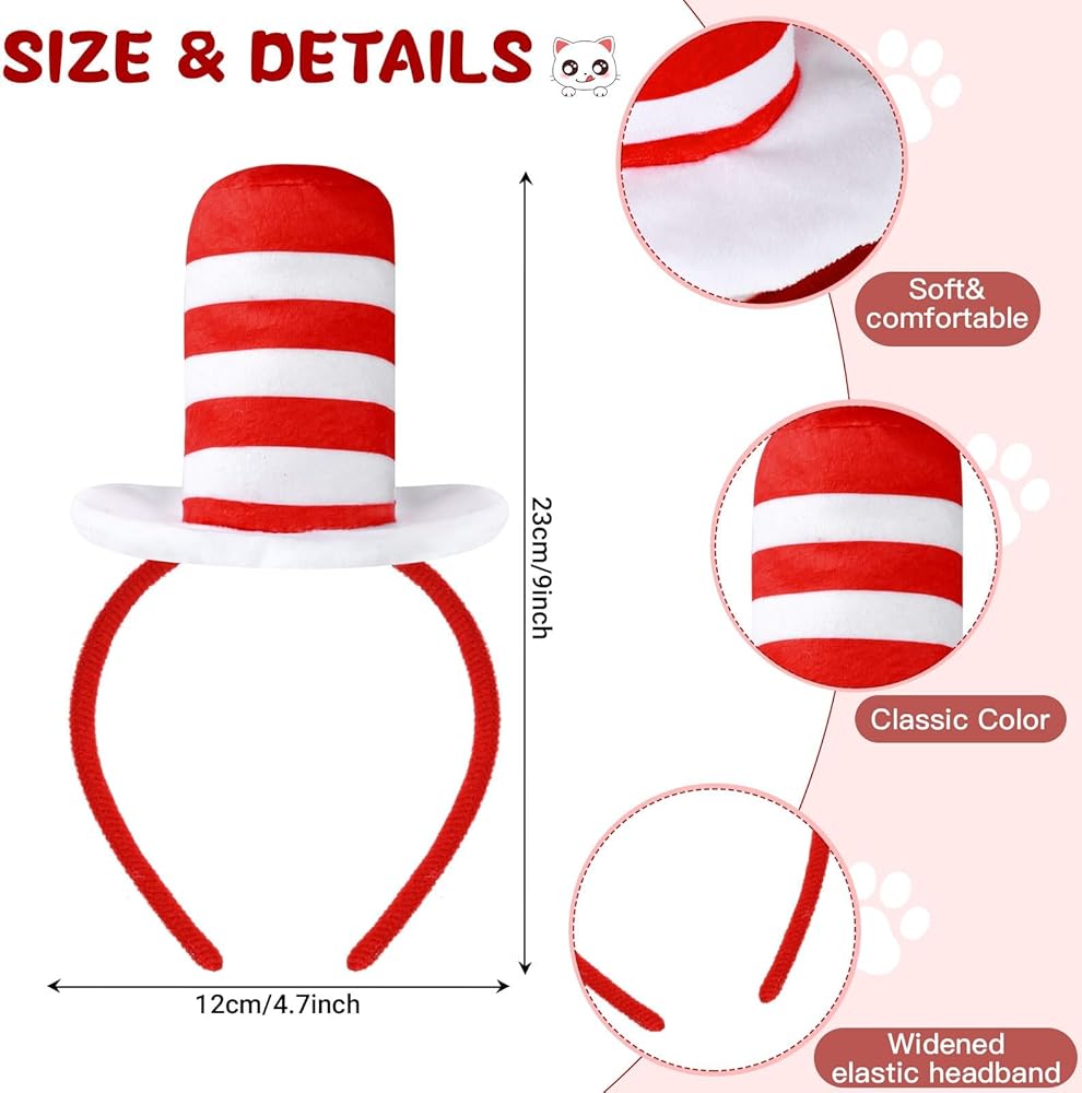 1 Pcs Hat cat Headband Red and White Striped Stovepipe Hat Headwear with 2 Pcs Blue Ponytail Headband for Book Week Cosplay Party