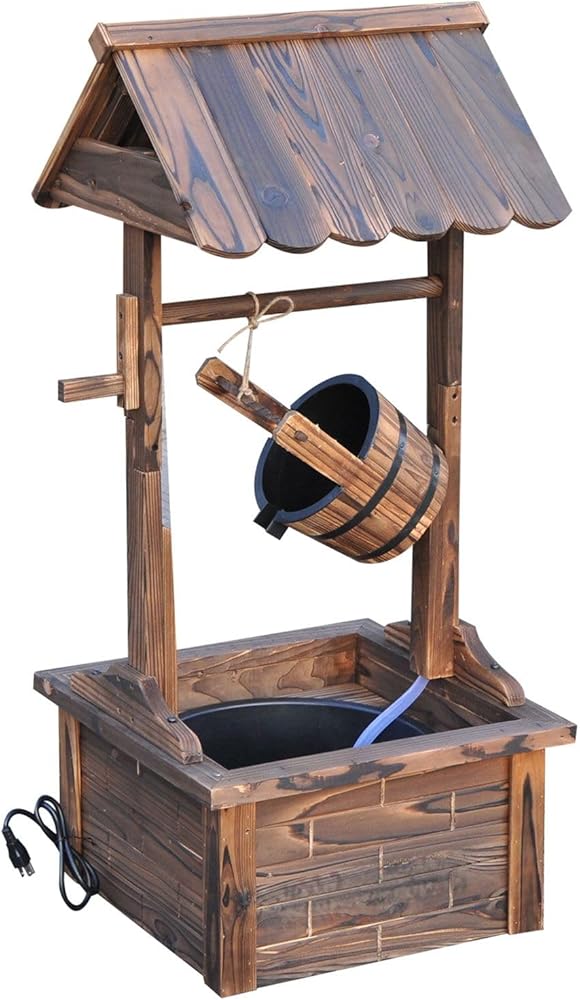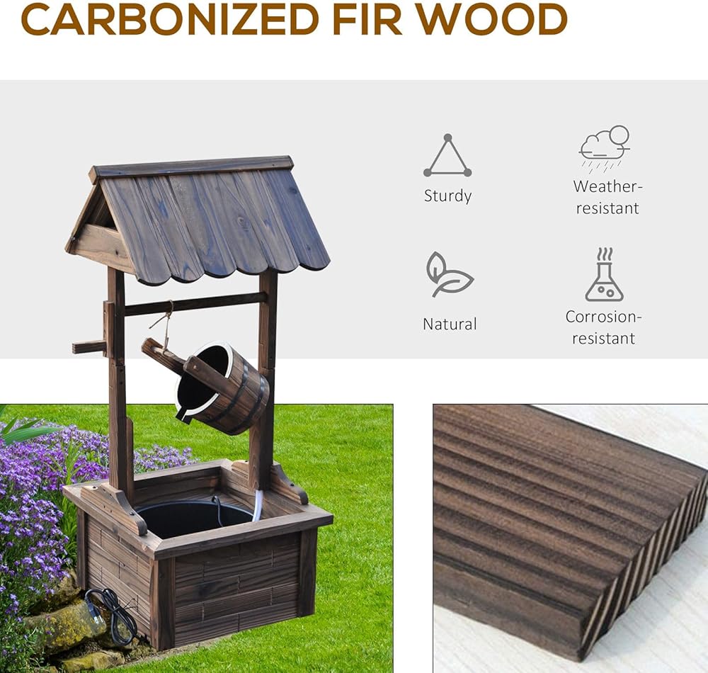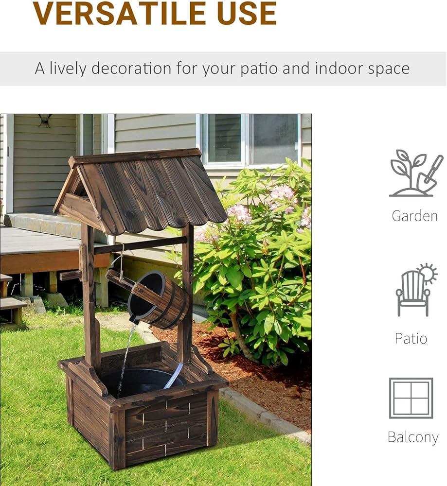 This elegant outdoor water fountain features a round wishing well bucket with plastic liner for a graceful fountain effect. Crafted from solid fir wood with carbonization treatment, it withstands weather elements for long-term outdoor use. The included 120V electric pump operates at 3600 RPM to ensure smooth water circulation. Ideal for backyards, patios, gardens, or balconies, this garden ornament adds vitality and serene ambiance to any space.