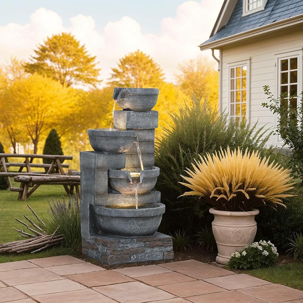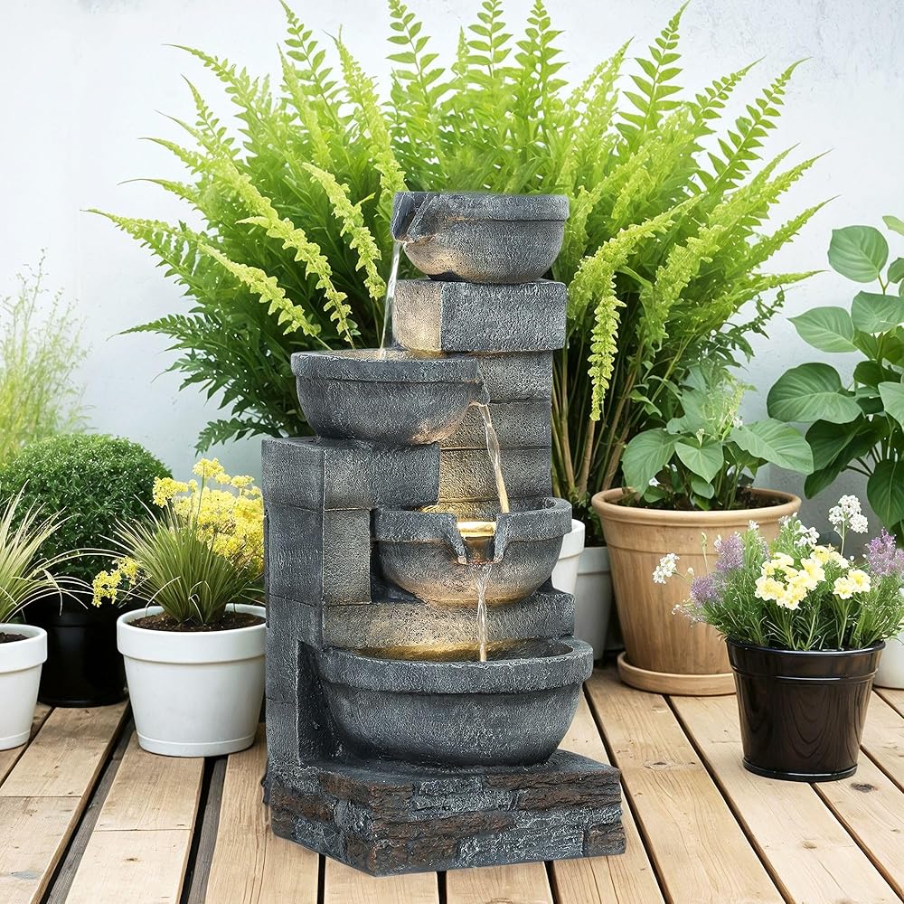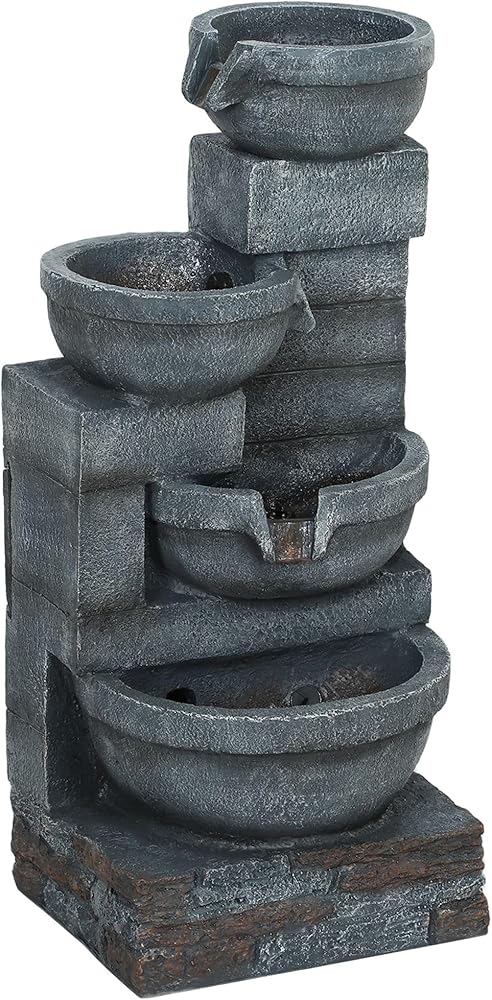 Transform your garden into a serene retreat with the outdoor fountain. This four-tier cascading outdoor water fixture features LED lights and a customizable water flow, creating the captivating outdoor ambiance of your choice. The included pump ensures independent water circulation, maintaining a constant flow of water at a variety of intensity levels. The natural-looking gray bowls blend seamlessly into any space, making it a stylish addition to your patio, backyard, or garden.