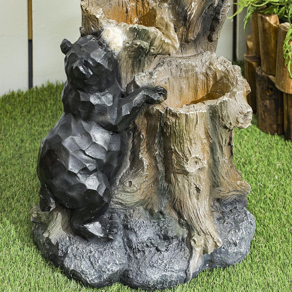 Elevate your outdoor space with this charming three-tier patio fountain featuring rustic charm and soothing water sounds. Crafted from weather-resistant resin with IP44 protection, it withstands sun, rain, and cold while maintaining vibrant color. Includes built-in LED lights for captivating ambiance and a low-voltage pump for adjustable water flow. Perfect for gardens, patios, and balconies, this fountain features a playful bear and beehive design that creates a serene retreat. Assembly required for setup.